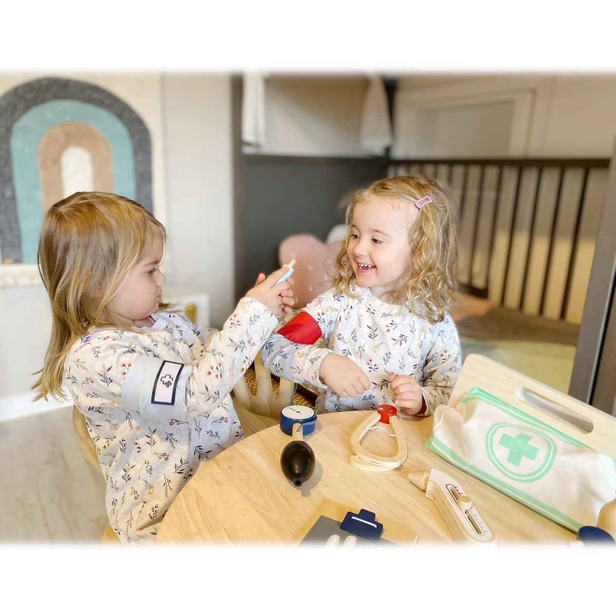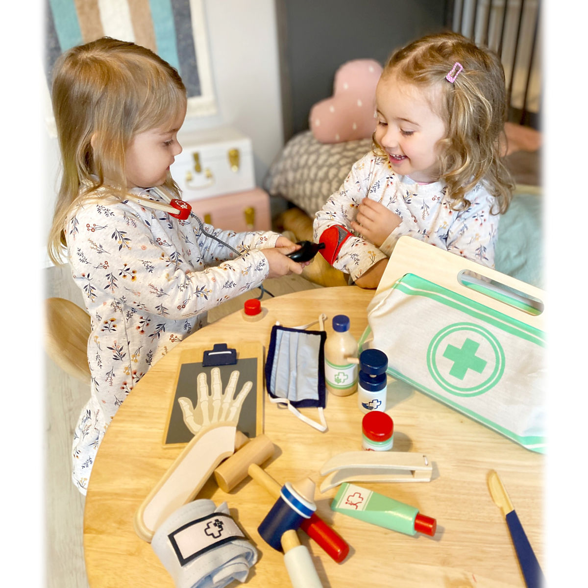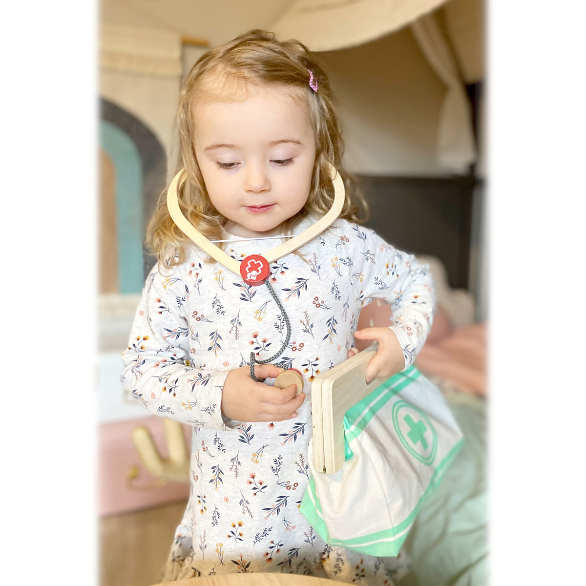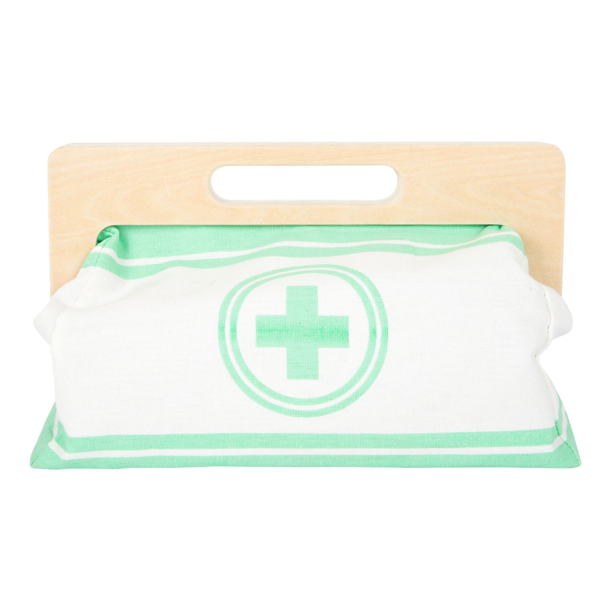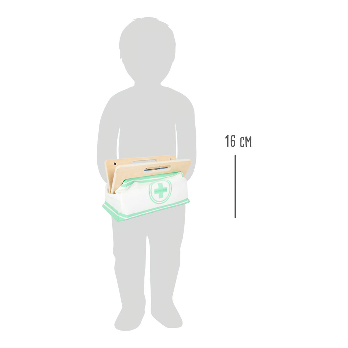 S ovom standardnom liječničkom torbom mladi će budući liječnici biti savršeno opremljeni. Torba je izrađena od mekog tekstila, lijepog je izgleda i vrlo funkcionalna. Lako se otvara zahvaljujući magnetima, izrađena je od drva. Unutar torbe pronaći ćete svu opremu za maštovito liječenje pacijenata: stetoskop, termometar, štrcaljku i mnogo više – sve izrađeno od čvrstog drva! Najbolji dodaci su vjerojatno tlakomjer s manžetom i balonom te otoskop s lupom. Ovaj opsežan set liječničkih igračaka sadrži mnogo "pravih" medicinskih alata i uređaja s kojima će se djeca zaista zabaviti. Ilustracije na medicinskim pomagalima pomoći će djeci prepoznati alate i možda im olakšati njihovu upotrebu. Glavne značajke: Liječnički torba s jasno vidljivim drvetom Tlakomjer s manžetom i balonom Termometar s podesivom temperaturom Otoskop s pravom lupom Bočica za lijekove s navojnim poklopcem Flasteri na čičak Ponovno upotrebljive i perive dječje tekstilne maske Dodatna oprema: injekcijska štrcaljka s pokretnim mehanizmom, stetoskop, dezinfekcija s pumpicom, bočica s lijekovima i žličica, pinceta, skalpel, refleksni čekić