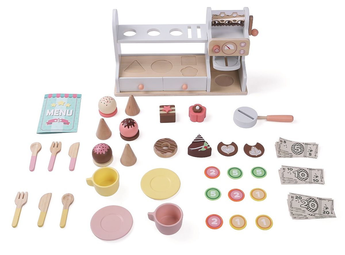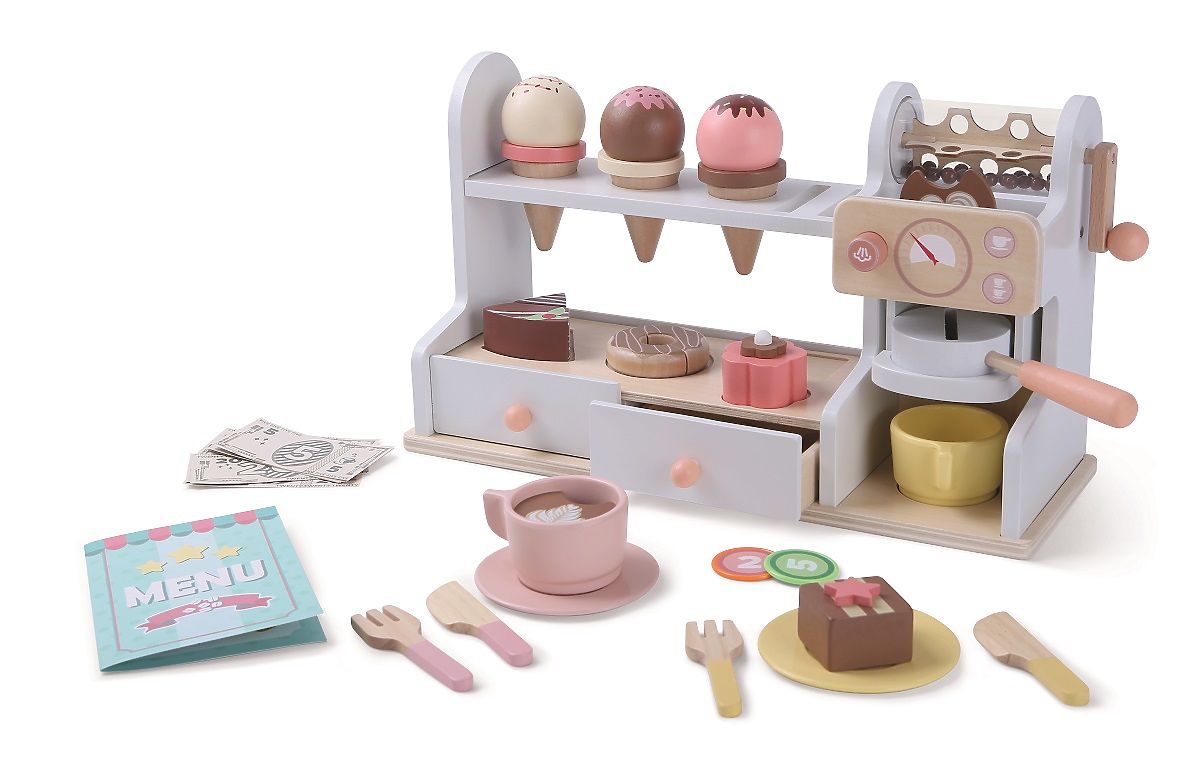 Postani pravi barista ili trgovac! Želite li sladoled, kolač ili samo ukusnu kavu? S ovim setom od 46 dijelova uživat ćete u satima zabave. Set nudi šalice s tanjurićima, pribor za jelo i žlice, pult s aparatom za kavu, vitrinu s kolačima i policu s rupama za sladolede. Tu su i ladice s prostorom za pohranu novca, koji je također dio ovog seta. Igračke za igru uloga potiču dječju maštu i inspiriraju na kreativnu igru, što pozitivno utječe i na njihov rječnik i razvoj jezika. Glavne značajke: sadrži 46 dijelova, podržava razvoj jezika i rječnika