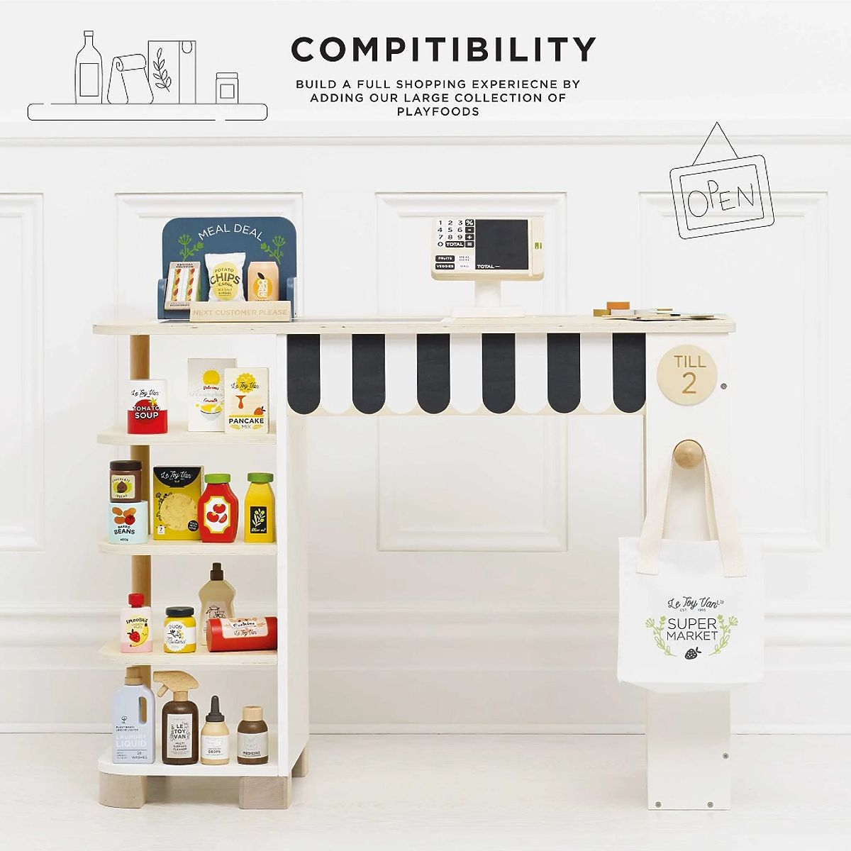 Ovaj prodajni štand ima sve što možete poželjeti za savršeno iskustvo kupovine u udobnosti vašeg doma. Uključuje policu na koju se mogu postaviti razne namirnice. Isporučuje se s kompletnim setom realističnih namirnica koje uključuju, na primjer, osvježavajuću limenku pića, vrećicu čipsa, kečap, senf, tjesteninu... što obećava autentično iskustvo kupovine za sve koji vole kupovati. Kako bi iskustvo bilo još zanimljivije, tu je elegantna blagajna, ploča za pisanje, pokretna traka, skener, igraći novac, natpis "sljedeći kupac", ploča s posebnim ponudama, pamučna "torba za cijeli život" te kartice za plaćanje, nagrade i vjernost. Svi dijelovi su izrađeni od održivih materijala, uključujući FSC certificirano drvo i prirodni pamuk. Set je 100% bez plastike. Igračke s ciljemSve igračke tvrtke Le Toy Van izrađene su s ciljem – da dugo traju. Dizajnirane s ljubavlju od strane iskusnih obrtnika koristeći etičke prakse i održive materijale koji su blaži prema našem planetu. Glavne značajke: multifunkcionalan, raznolika upotrebapotiče komunikacijske i socijalne vještine djeceizrađeno od FSC® certificiranog drva uključujući bogat pribor100% bez plastike Marka i certifikat FSC® (Forest Stewardship Council) jamči da drvo od kojeg je proizvod izrađen nije ilegalno posječeno i dolazi iz šuma koje se održavaju na ekološki prihvatljiv ili prirodi blizak način, gdje se poštuju strogi ekološki i socijalni zahtjevi. FSC® oznaka na proizvodu znači da svojim kupnjom pomažete zaštiti šume i podržavate održivo, odgovorno ili prirodi blisko gospodarenje, zahvaljujući kojem su naše šume stabilnije, zdravije, imaju prirodan sastav vrsta i bolje odolijevaju negativnim posljedicama klimatskih promjena. Honeybake kolekcija: Igračke u ovoj kolekciji su prikladne za istraživanje, pomažu djeci u razvoju mašte, socijalnih i verbalnih vještina te kognitivnih funkcija. Tradicionalni dizajn s modernim detaljima zasigurno će zabaviti djecu. Honeybake je kolekcija Le Toy Van koja je osvojila najviše nagrada za dizajn, kvalitetu, sigurnost te za obrazovnu i igračku vrijednost.
