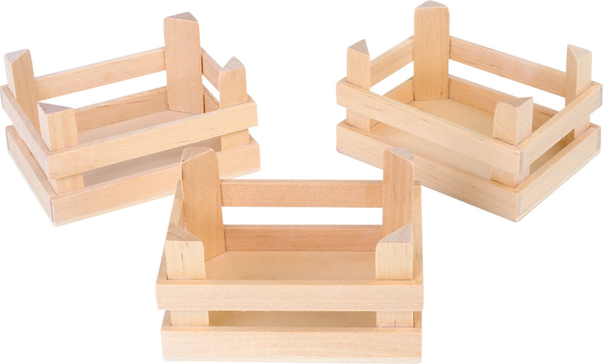 Čvrste i izdržljive drvene kutije su svestrano upotrebljive. Mogu se koristiti kao dodatak nekoj od široke ponude štandova za igru prodavača, ali također mogu poslužiti za razvrstavanje i održavanje reda, bilo u dječjoj sobi ili u vrtu. Zahvaljujući prirodnoj obradi, možete ih obojiti i lakirati prema svojoj mašti i potrebama. Glavne značajke: set od 3 kom kutija, čvrsta i izdržljiva izrada, mogućnost vlastite prilagodbe.
