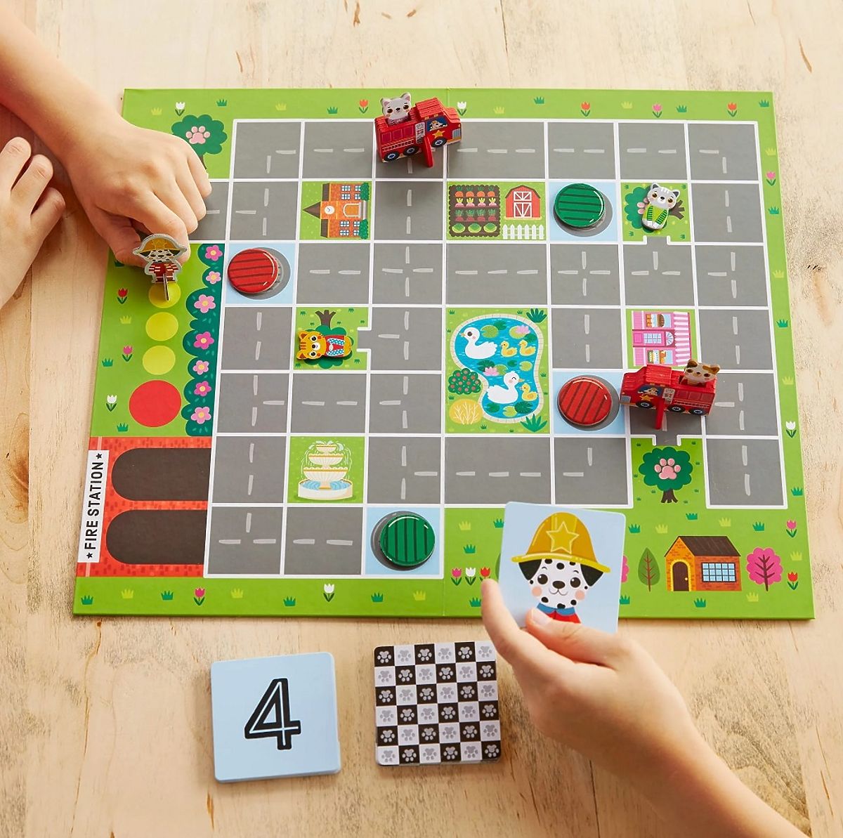 Predstavljamo vam društvenu igru na ploči, u kojoj ćete se prenijeti na spasilačku akciju vatrogasaca. Mala mačića su zapela na drveću i trebaju pomoć svih igrača. Svi surađuju na njihovom spašavanju prije nego se zapovjednik vatrogasaca vrati u stanicu. Ali pazite, semafori na ploči igre mogu se promijeniti iz zelene u crvenu i zaustaviti vas. Igra sadrži ploču za igru, 27 karata, 4 pločice semafora, 4 pločice mačića, 2 drvena vatrogasna vozila i 1 stojećeg zapovjednika vatrogasaca. Drvena vatrogasna vozila imaju otvore u koje se mačići umeću kada se vraćaju u stanicu. Ova igra je idealna za obiteljsku zabavu. Djeca će kroz igru naučiti surađivati u timu. Glavne značajke: prikladno od 4 godine razvija koncentraciju i maštu igra za cijelu obitelj tiskano netoksičnim bojama na bazi soje izrađeno korištenjem recikliranih i održivo dobivenih materijala