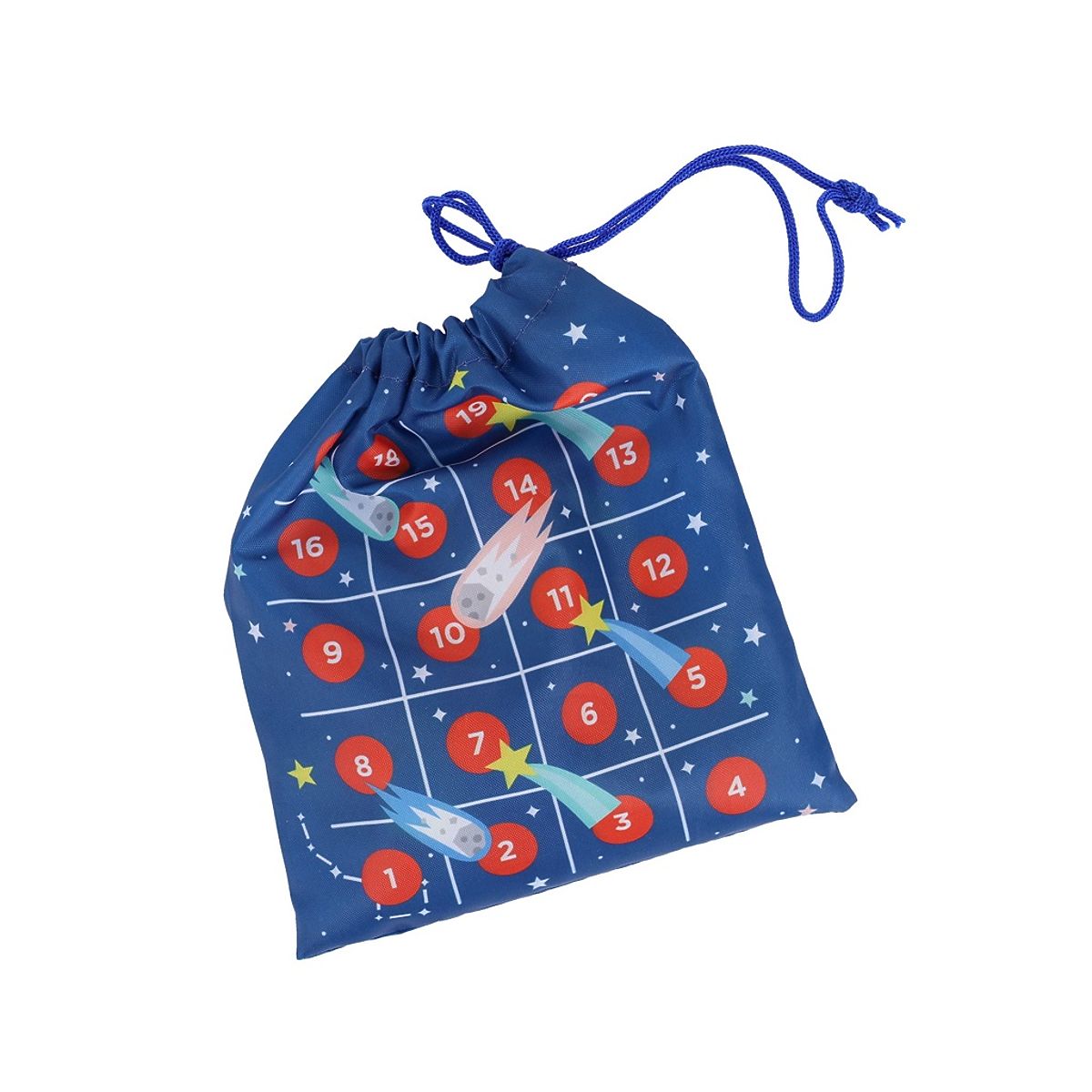 Putujte galaksijom uz dvije omiljene igre! Putna igra 2 u 1 Svemirska avantura je verzija klasičnih zabavnih igara križić-kružić i zmije i ljestve. Igra uključuje 10 drvenih figurica u obliku raketa i planeta, kocku za igranje i upute za igru. Igrači pomiču planete i rakete po mrežama ispisanim na praktičnoj putnoj vrećici s uzorkom svemira i vezicom za zatvaranje. Kada se igrač zaustavi na polju s kometom, napreduje za jedan red više, a polje s padajućim meteoritom ga vraća za jedan red niže. Igre su izvrstan način za poučavanje djece strpljenju, koncentraciji, komunikaciji s drugim igračima, kako pobijediti, ali i izgubiti. Za mlađu djecu, pomicanje figurica po ploči je izvrsna vježba koordinacije ruka-oko, spretnosti i prepoznavanja boja i oblika. Svi dijelovi igre izrađeni su od recikliranih materijala. Platnena vrećica je od recikliranog PET-a, vezica od recikliranog PP-a, a drvene figurice od recikliranog drva. Glavne značajke: 2 igre u praktičnom putnom pakiranju, verzije omiljenih igara križić-kružić i zmije i ljestve, uče strpljenju, koncentraciji, pobjedi i porazu, razvijaju koordinaciju ruka-oko, potiču prepoznavanje boja i oblika, za 2 igrača, prikladno za djecu od 4 godine.