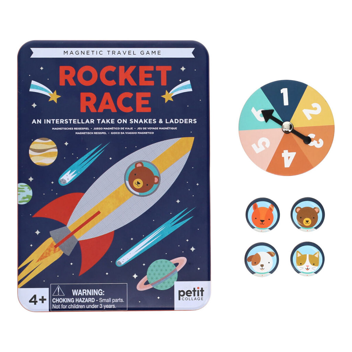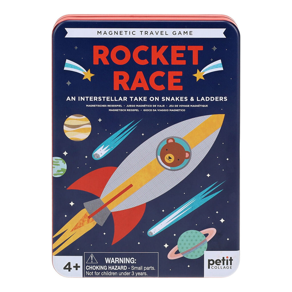 Pokrenite ovu svemirsku utrku! Zabavna igra u metalnoj kutiji puna veselih ilustracija. Igra je svemirska verzija Zmija i ljestava. Naizmjence okrećite kotačić sa strelicom, koji pokazuje koliko polja se pomičete. Ako se zaustavite na polju s gorućim gorivom rakete, pomaknite se prema gore na tijelo rakete. Pokušajte izbjeći rep komete, jer ako se zaustavite na takvom polju, padate dolje, na njezinu jezgru. Pakirano u reciklabilnoj metalnoj kutiji, otvaranje na šarke. Nakon otvaranja otkrivate ilustriranu ploču za igru, 4 magnetska dijela, 1 kotačić sa strelicom, upute za igru. Pogodno za 2-4 igrača od 4 godine. Glavne značajke: putna magnetska igra, trenira strpljenje, kutija služi kao ploča za igru.