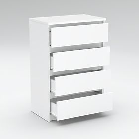 Komoda nudi četiri prostrane ladice koje su opremljene sustavom tihog zatvaranja. Gornja ploča pruža prostor za pohranu dekoracije ili drugih predmeta.