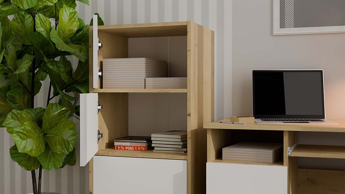 Zahvaljujući prostranim policama skrivenim iza glatkih vrata, komoda pruža mnogo prostora za pohranu i olakšava održavanje reda u svakom prostoru.