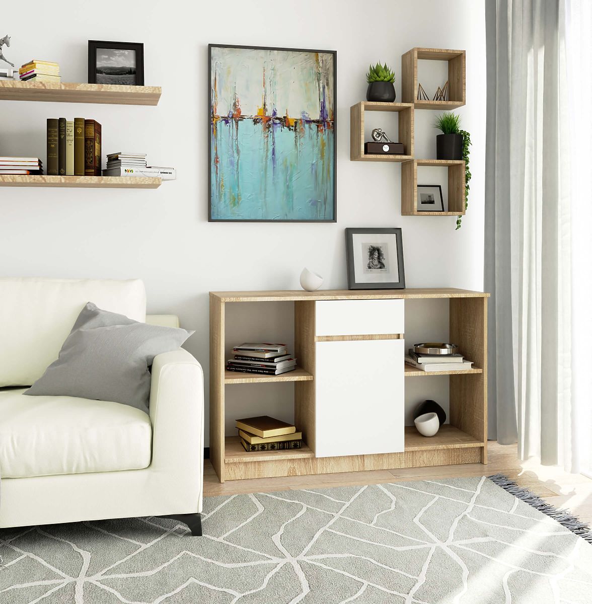 Pametni dizajn komode B-17 čini je prikladnom za prostorije poput dnevnog boravka, spavaće sobe, hodnika ili garderobe. Kombinira otvorene police s zatvorenom ormarićem i ladicom. Ladica ima mogućnost blokade, što omogućuje pohranu vrijednih stvari. To je odlično mjesto za smještaj sitnica, suvenira i raznih dekoracija. Kombinacija bijele i svijetlog drva čini je prikladnom za moderne aranžmane.