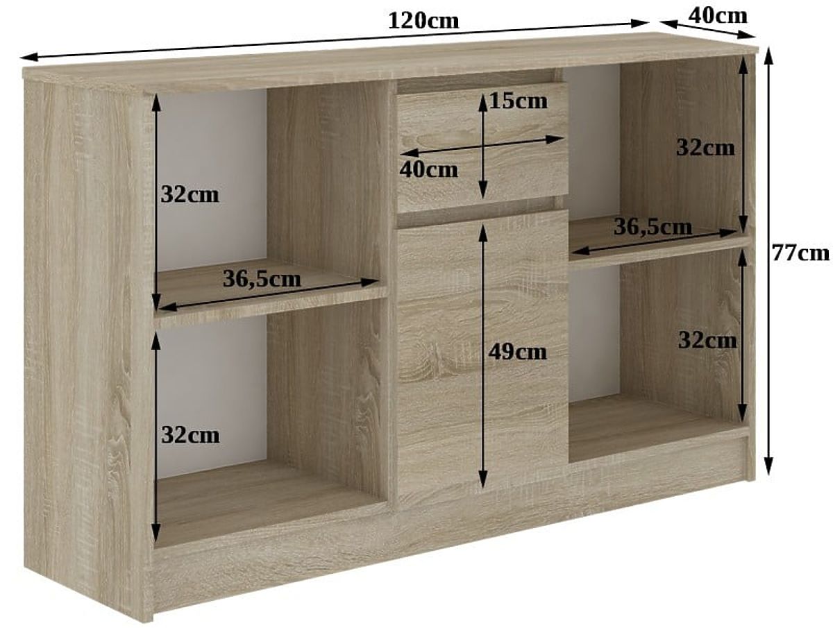 Dimenzije namještaja su 120 cm x 77 cm x 40 cm. Sve osobe koje traže atraktivnu, kvalitetnu, ali i cjenovno povoljnu opciju za uređenje prostorije, pozivamo na bliže upoznavanje s ovom zanimljivom ponudom. Nadamo se da će ispuniti očekivanja i najzahtjevnijih osoba. Komoda se sastoji od dvije otvorene police, jedne iza vrata i jedne ladice. Cijeli se lijepo prezentira samostalno i u kombinaciji s drugim namještajem iz ove serije. Pozivamo vas na kupnju.
