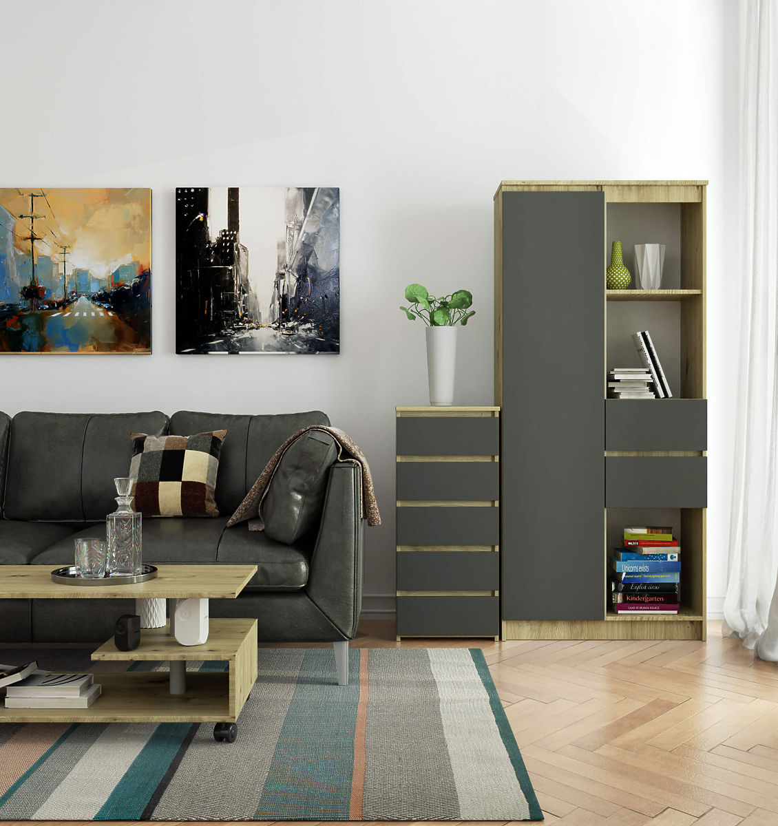 Elegantna komoda CL5 s 5 ladica u hrastu artisan i sivoj boji. .. više