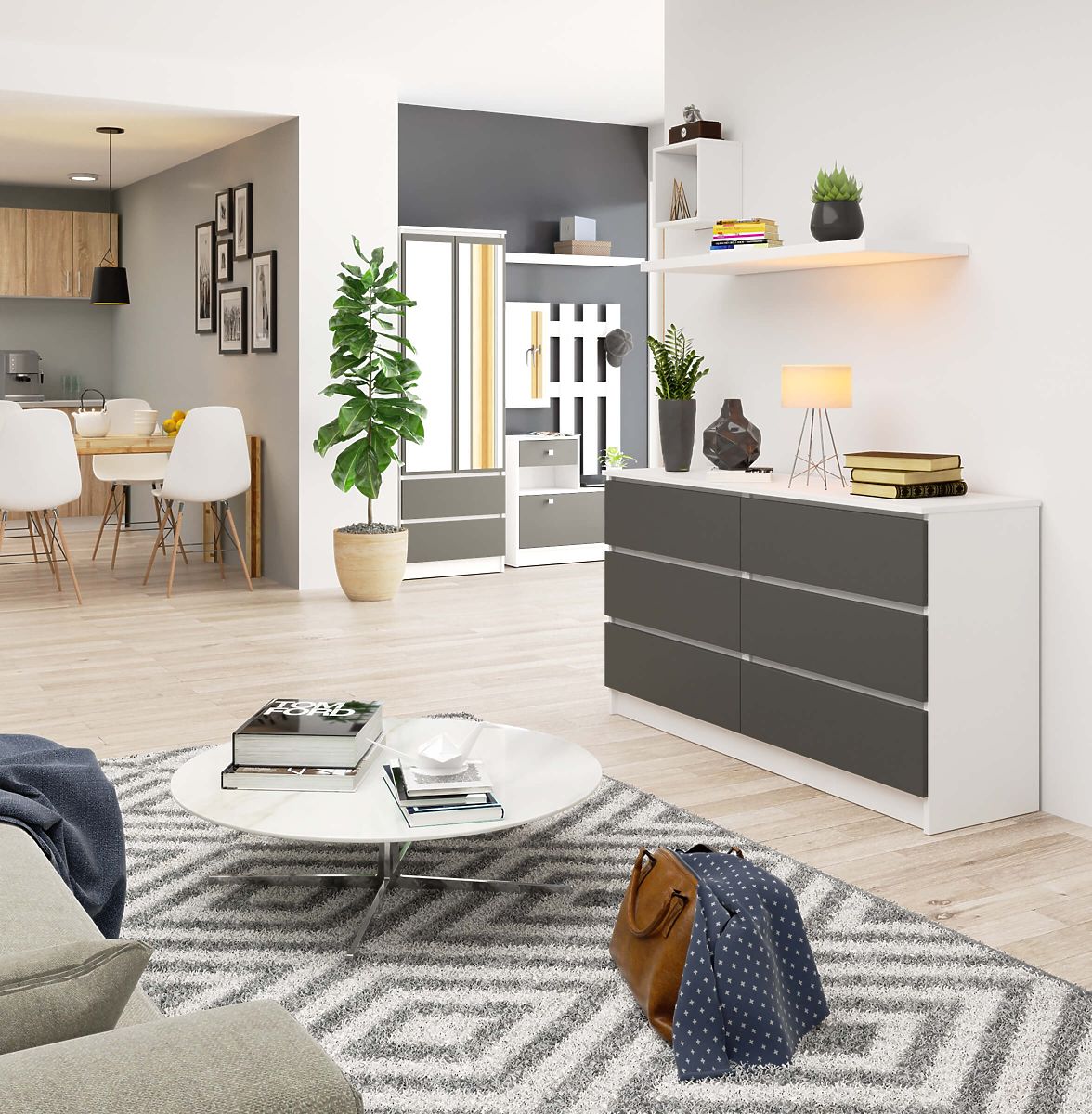 Komoda s 6 ladica u bijeloj i grafit sivoj boji. .. više