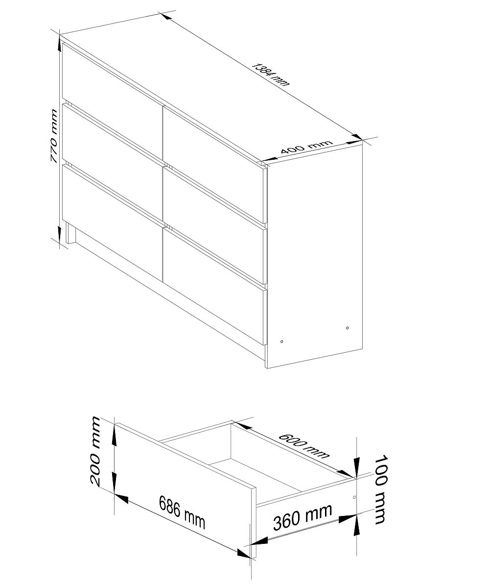 Materijal od kojeg je komoda izrađena je laminirana ploča otporna na habanje debljine 16 mm. Njeni rubovi su opremljeni ABS rubom koji ih čini otpornima na oštećenja. Opremljena je s šest ladica. Svaka od njih se kreće na metalnim kugličnim vodilicama - ovaj mehanizam radi glatko i bez problema.