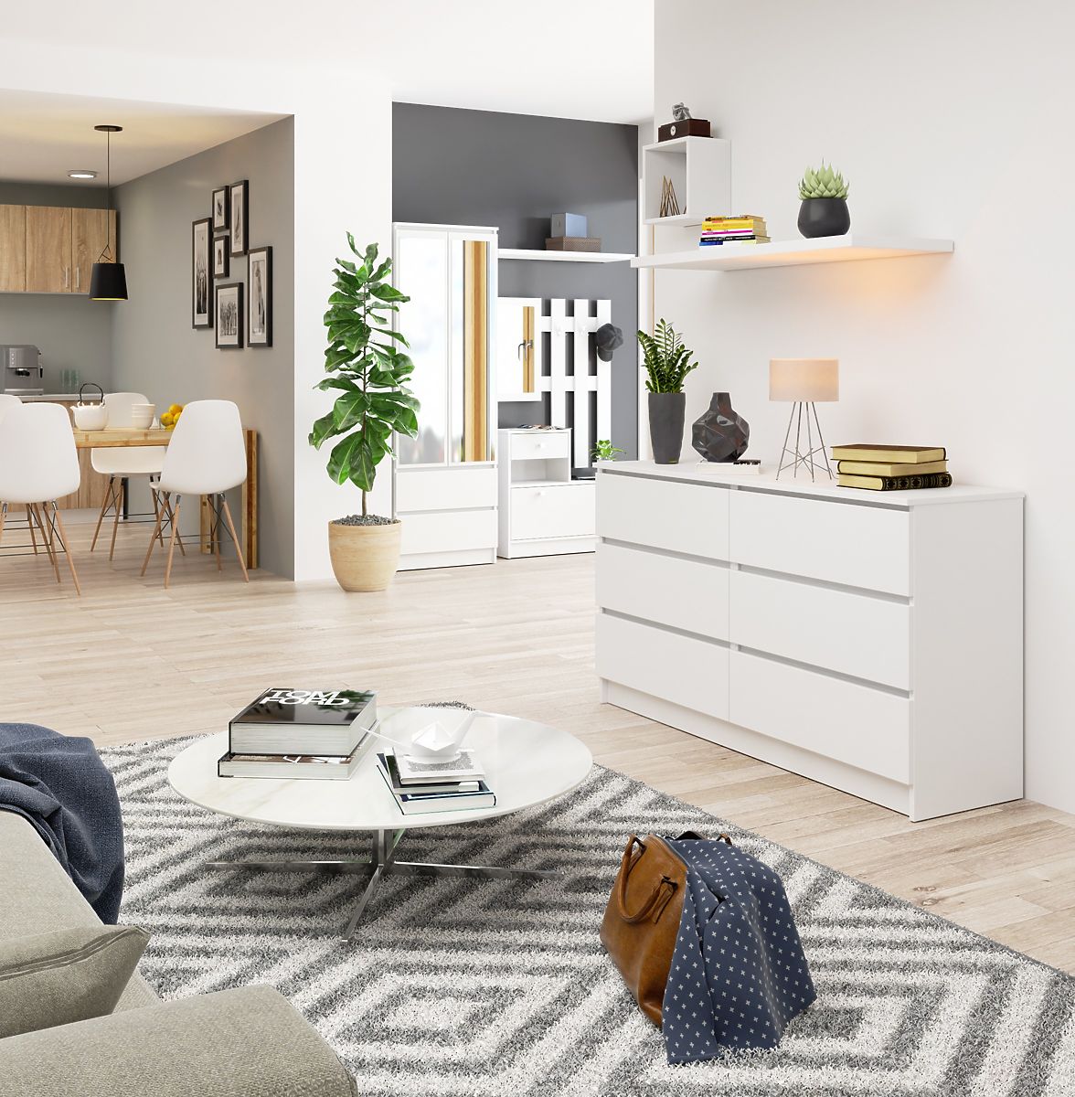 KOMODA K140 6 LADICA je jednostavan i minimalistički komad namještaja. Odlično se uklapa u prostorije s modernim i skandinavskim dizajnom gdje prevladavaju svijetle boje. Ovaj bijeli namještaj idealan je za dnevni boravak, spavaću sobu, hodnik, ali i za ured ili radnu sobu. Njegova visina je 77 cm, dužina 140 cm i dubina 40 cm.