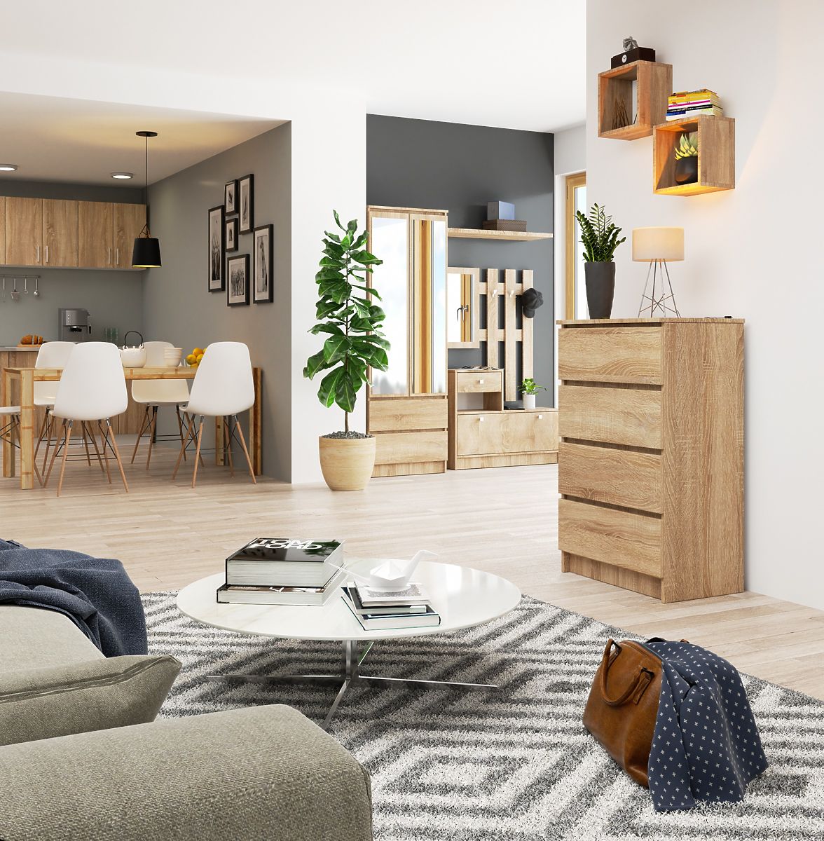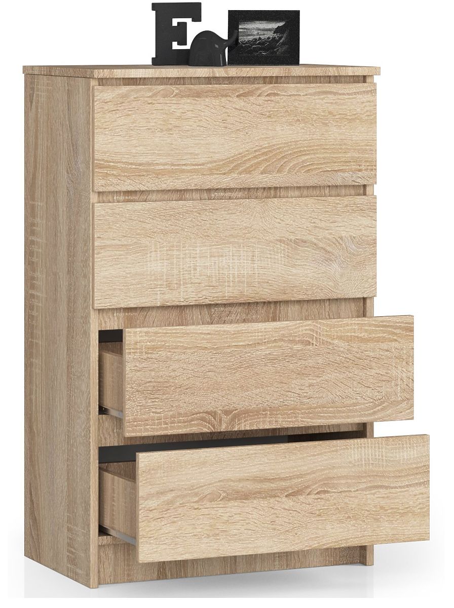 Mala komoda K60 prijedlog je u modernoj, vrlo popularnoj boji među kupcima. Naravno, riječ je o hrastu sonoma - nijansi koja se savršeno uklapa u moderne interijere, vrlo je univerzalna i izvrsno se kombinira sa svim ostalim bojama. Sama komoda je visokokvalitetni namještaj opremljen s četiri praktične ladice. Prijedlog je namijenjen osobama koje žele opremiti svoj dnevni boravak, spavaću sobu, predsoblje, blagovaonicu, ali i uredski interijer. Visoka kvaliteta u kombinaciji s niskom cijenom zasigurno će uvjeriti kupce koji cijene jednostavnost i eleganciju u najboljem izdanju. Uz komodu možete prilagoditi i drugi namještaj iz iste kolekcije, stvarajući tako željenu aranžaciju bilo kojeg odabranog prostora.