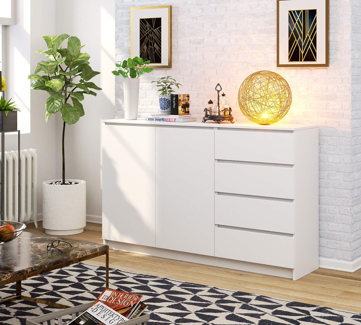 Komoda, model K 013, je namještaj u univerzalnoj bijeloj boji. Bezvremenska bijela savršeno se uklapa u bilo koji stil interijera, jer se odlično kombinira kako s prigušenim, tako i s energičnijim bojama. Komoda je namještaj s izuzetnim dizajnom koji predstavlja najviše vizualne vrijednosti.