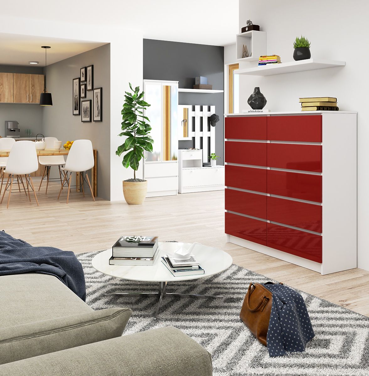 Komoda bijela / crveni sjaj je namještaj koji dobro izgleda na pozadini bijele, mornarsko plave, sive i cappuccino, ali odvažniji je mogu kombinirati s energičnom narančastom, boce zelenom ili dubokom ljubičastom. Namještaj se odlično uklapa u dnevni boravak, krojačke i zanatske radionice, u moderne urede uređene u odvažnom stilu s šarmom. Također se može uspješno uklopiti u klasične aranžmane.