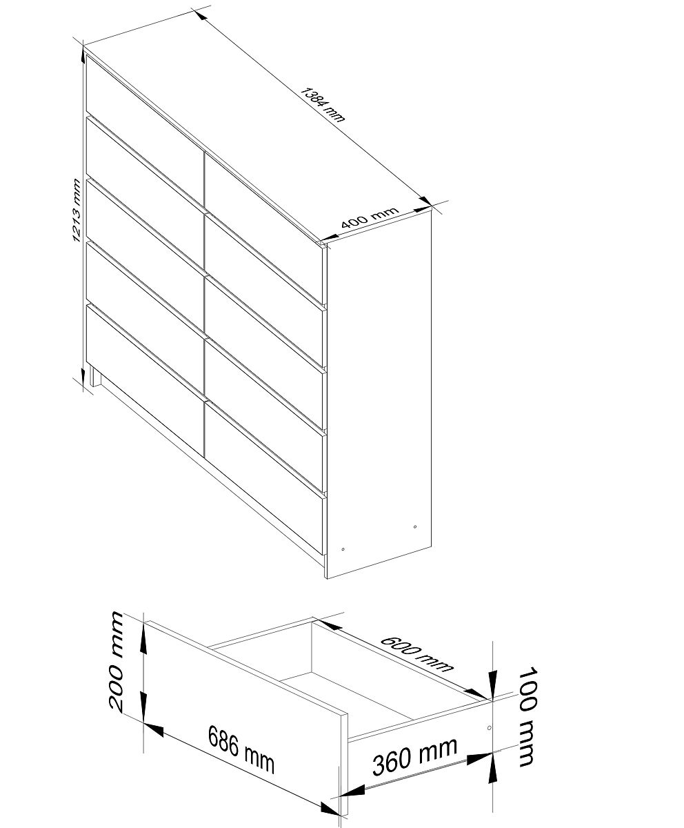 Bijela komoda u minimalističkom stilu, koja se odlično uklapa kako u moderne interijere, tako i u manje prostore koji trebaju osvjetljenje i optičko povećanje. Bit će praktičan prostor za pohranu - ima deset prostranih ladica, zahvaljujući kojima lako održavate red u stanu. Odlično se uklapa u dnevni boravak, radnu sobu ili uski hodnik.
