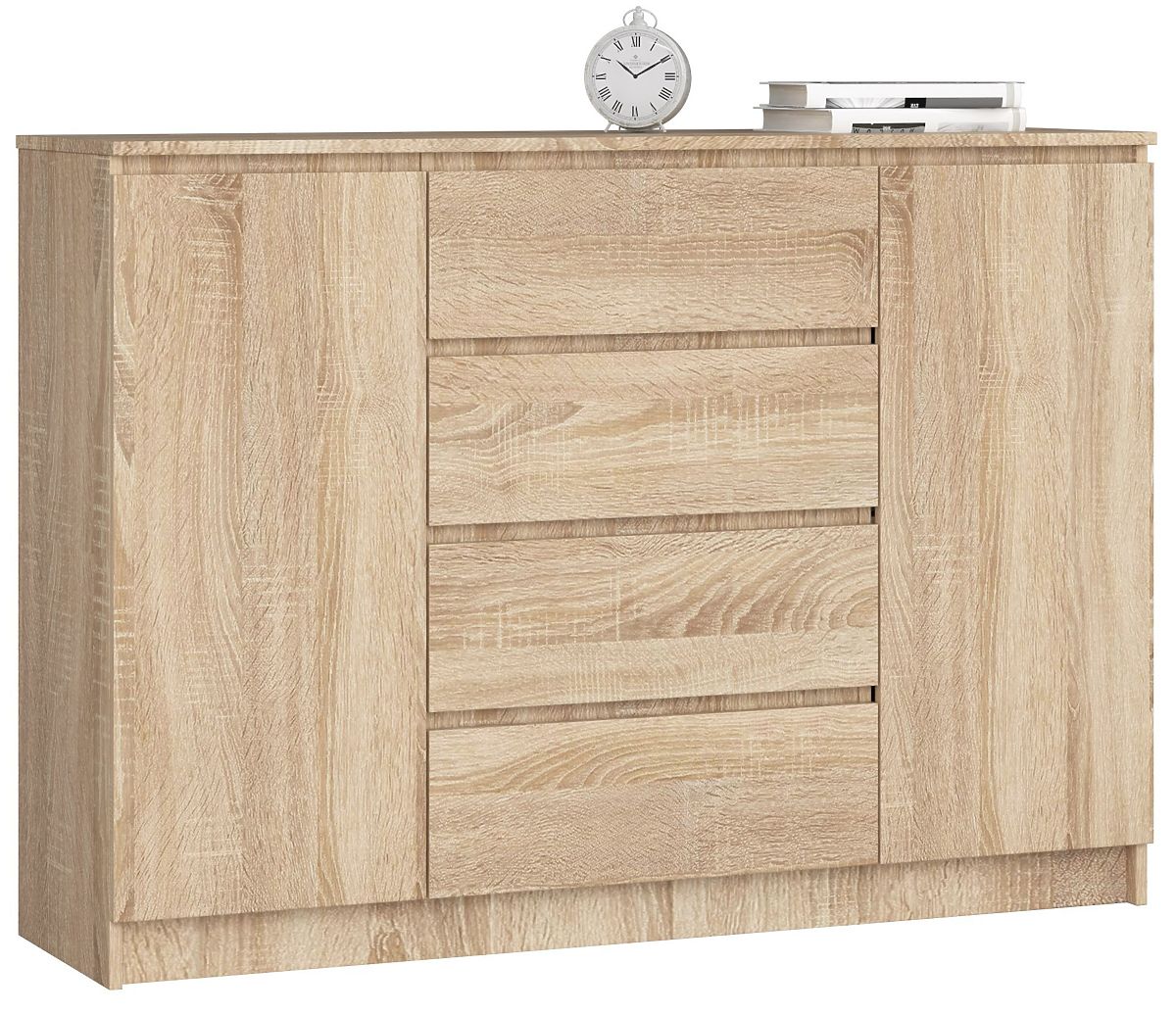 Velika, prostrana i funkcionalna komoda omiljeni je komad namještaja, posebno u prostorijama kao što su dnevni boravak ili spavaća soba. Predstavljamo komodu K140 dimenzija 99 cm visine, 138 cm dužine i 40 cm dubine, izrađenu od laminirane ploče debljine 16 mm proizvođača Kronospan. Zahvaljujući tome, otporna je na habanje. Rubovi su također pravilno zaštićeni ABS rubom. Namještaj ima 4 ladice koje se glatko kreću zahvaljujući metalnim kugličnim vodilicama i dva ormarića. Unutar svakih vrata nalazi se jedna polica. Namještaj je u boji hrasta sonoma, što je izuzetno elegantna i stilska boja. Komoda ima jednostavan oblik i univerzalan karakter, pa se odlično uklapa u prostorije s različitim stilovima i aranžmanima. Izdržljiva je, prostrana i udobna za korištenje.