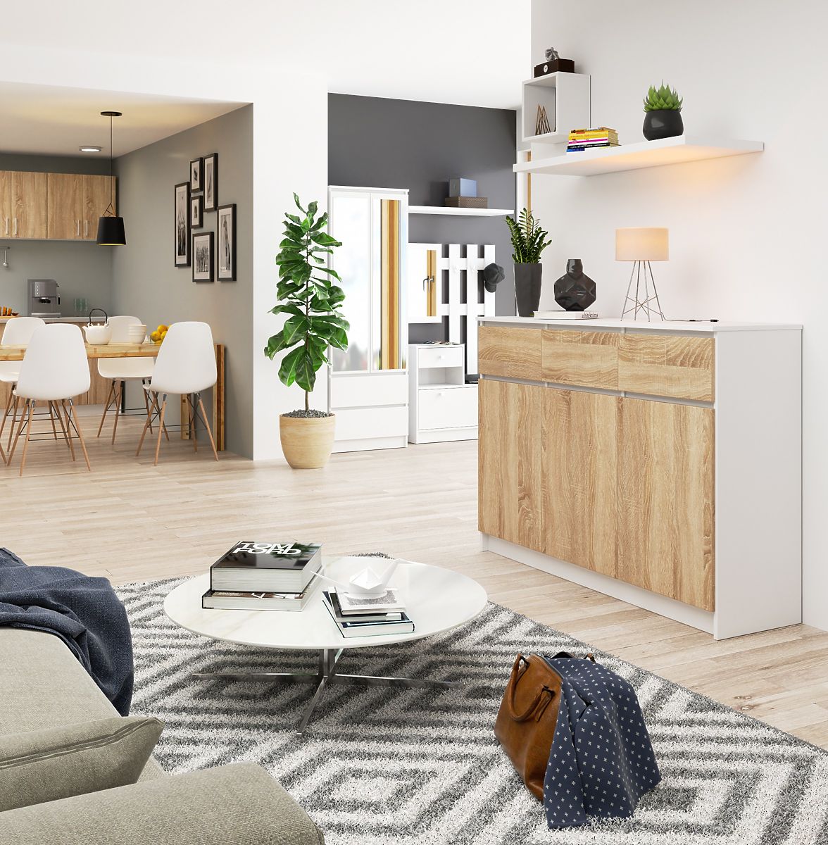 Komoda s bijelim tijelom i frontama od hrasta Sonoma. .. više