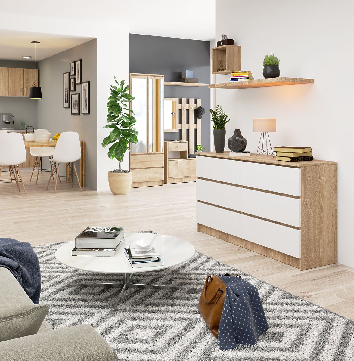 Velika komoda opremljena sa šest ladica zanimljiva je ponuda stvorena na temelju potreba i očekivanja kupaca koji prate najnovije trendove u uređenju, a preferiraju svijetli, lako održivi i prije svega funkcionalni namještaj. Komoda K140 je kombinacija dviju vrlo modernih boja - bijele i hrasta sonoma. Namještaj se može uspješno koristiti u dnevnom boravku, kao i u sobi za mlade ili goste. Također se uklapa u spavaću sobu, blagovaonicu ili ured.