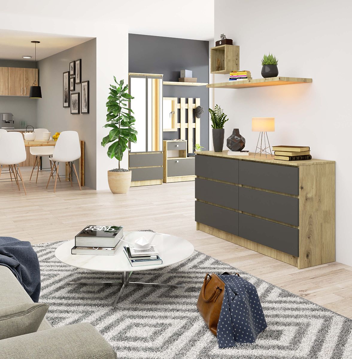Komoda s 6 ladica u hrastu Artisan i sivoj boji. .. više