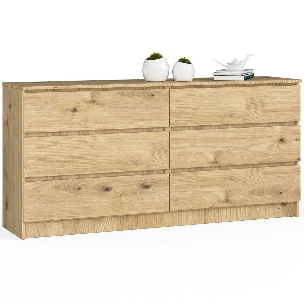 Moderna komoda K 160 cm je proizvod koji kombinira visoku estetiku izrade i funkcionalnost. Namještaj se sastoji od šest prostranih ladica, što ga čini korisnim u dnevnom boravku, dječjoj sobi, uredu, blagovaonici, kao i u mnogim drugim prostorijama gdje omogućuje pohranu mnogih predmeta. Komoda u zanimljivoj boji (hrast artisan) odlično se uklapa u interijere dizajnirane u industrijskom, modernom, skandinavskom ili loft stilu, a privući će i ljubitelje retro atmosfere. To je zanimljiva ponuda kojoj se mogu prilagoditi dodatne komode, ormari, police i pisaći stolovi dizajnirani u istom stilu. Minimalistički oblik u kombinaciji s visokom kvalitetom zasigurno će privući mnoge kupce.
