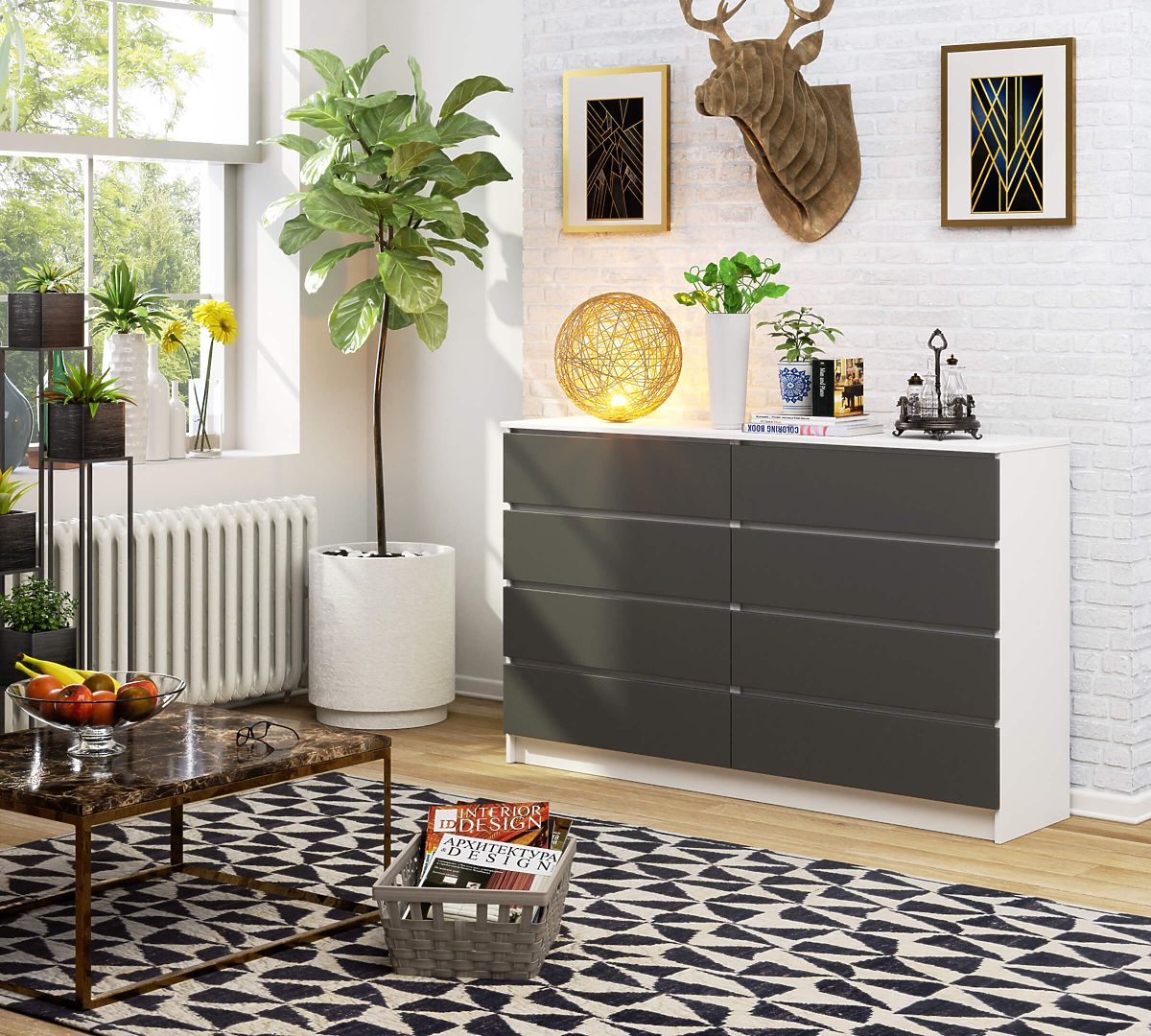 Komoda s 8 ladica izrađena od bijele i sive laminirane ploče. .. više
