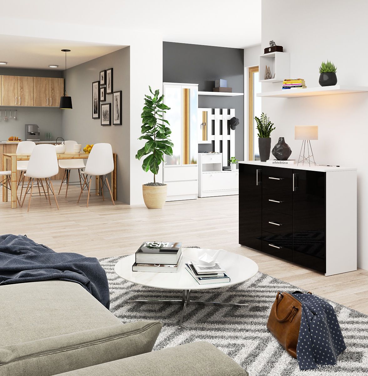 Komoda s crnim sjajem i bijelim mat korpusom. .. više
