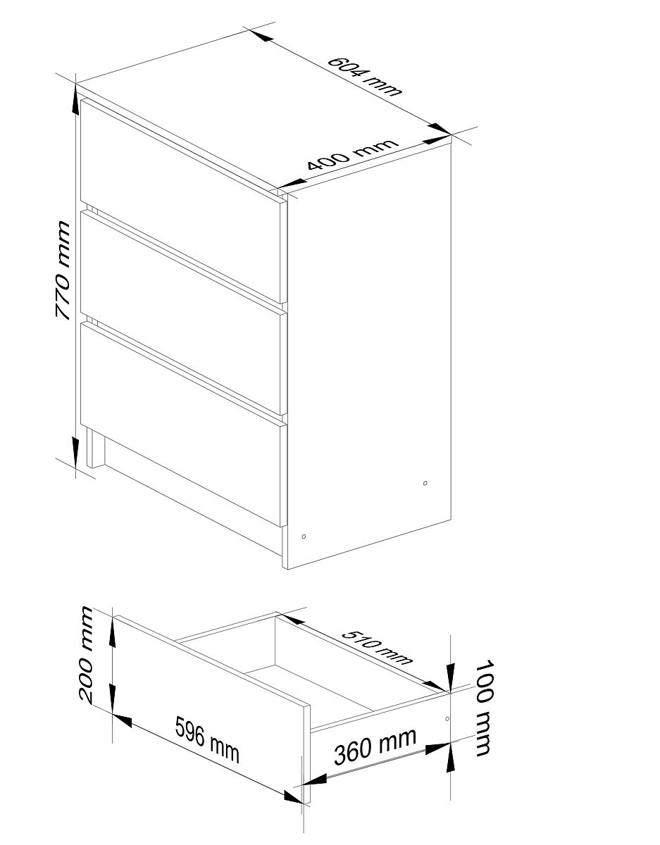 KOMODA K60 3 LADICE Izrađena od laminirane ploče debljine 16 mm otporne na habanje.
