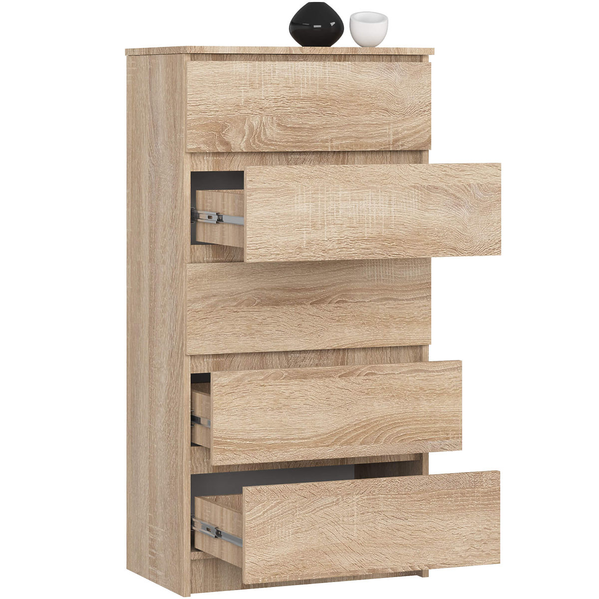 Primjerak u prekrasnoj boji sonoma ima pet prostranih ladica koje rade na izdržljivim kugličnim vodilicama. Ladice se izvlače i uvlače vrlo glatko. Komoda ima točno 60 centimetara dužine, visina modela je 121 centimetar, dok je dubina 40 centimetara. Laminirana ploča korištena u proizvodnji ima 16 milimetara, ABS rubovi povećavaju izdržljivost i produžuju vijek trajanja namještaja. Ukupna težina komode dostupne u našoj ponudi je točno 36 kilograma.