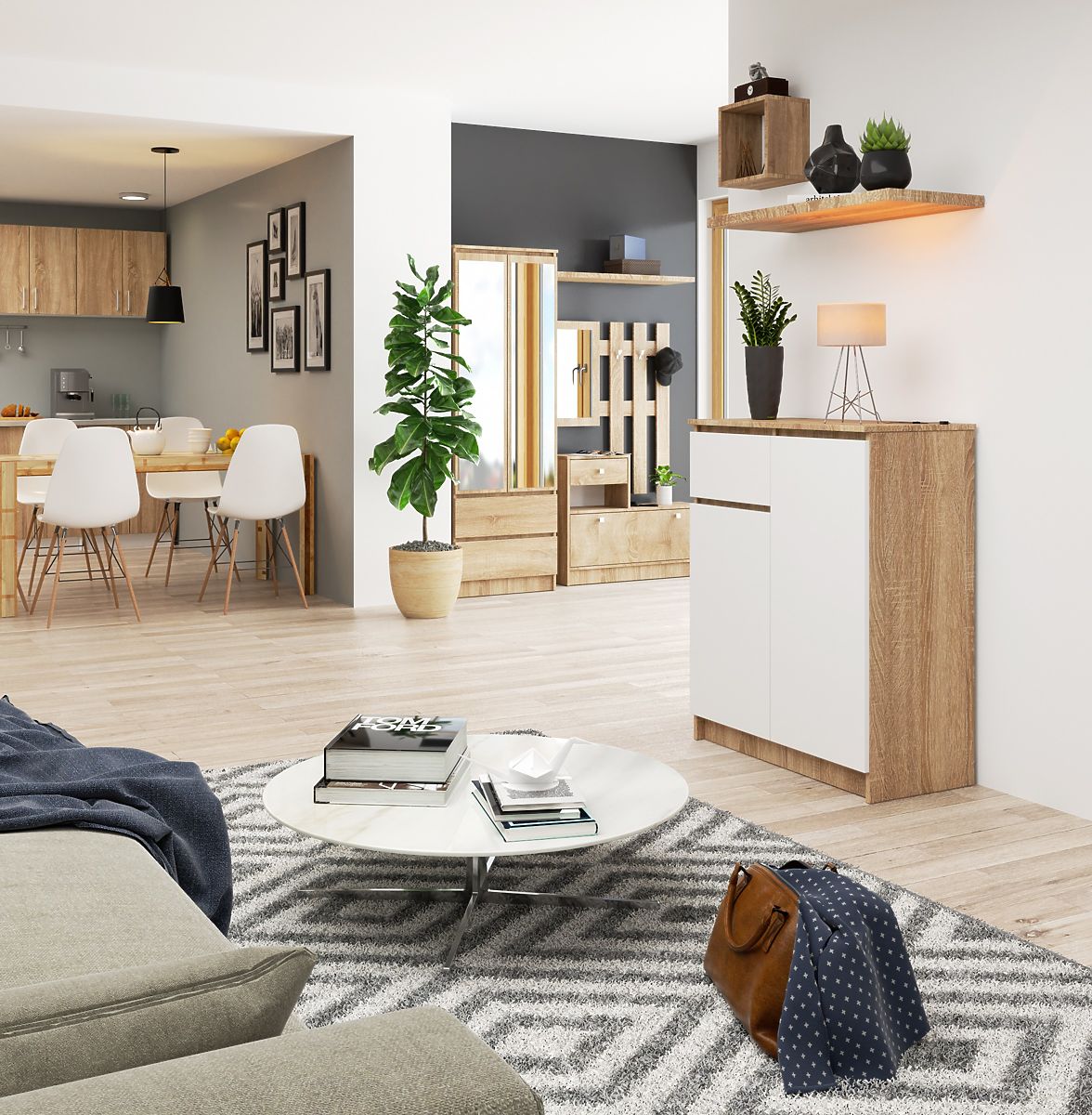 Komodu K 80 cm lako je kombinirati s drugim komadima namještaja, kao što su manji i veći ormari, pisaći stolovi ili police, koji su također dio ponude. Radi se o kvalitetnom, praktičnom namještaju po povoljnim cijenama. Zahvaljujući njemu, može se stvoriti svijetao, oku ugodan prostor opremljen jednostavnim, ali elegantnim namještajem koji se savršeno uklapa u svaki moderno uređen interijer.