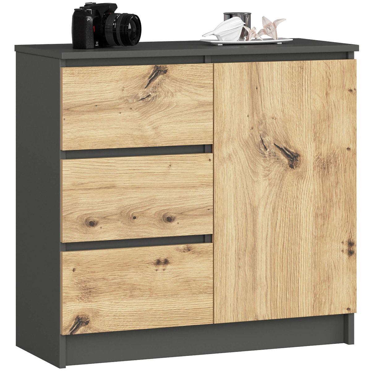 Mala komoda je dio opreme koja će naći primjenu u svakoj prostoriji. Moderne boje, čvrsta konstrukcija i pažljiva izrada rezultirali su ormarićem koji će se dokazati, na primjer, u predsoblju, dnevnom ili dječjem sobi, ali i u spavaćoj sobi. Može se koristiti i u uredskom prostoru, gdje omogućuje pohranu mnogih dokumenata i drugih uredskih potrepština. Komoda se sastoji od jednih vrata (unutra se nalaze dvije police) i 3 ladice. Namještaj kombinira boje grafit siva i dub artisan.