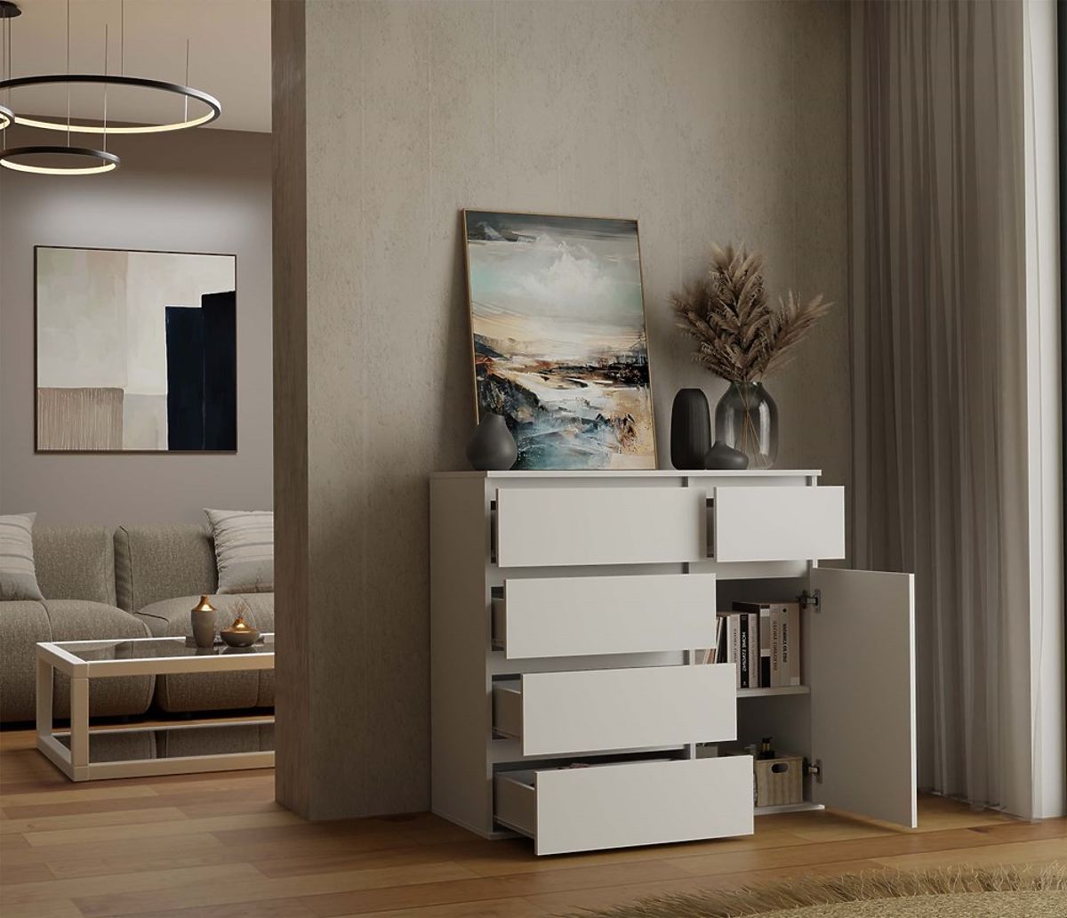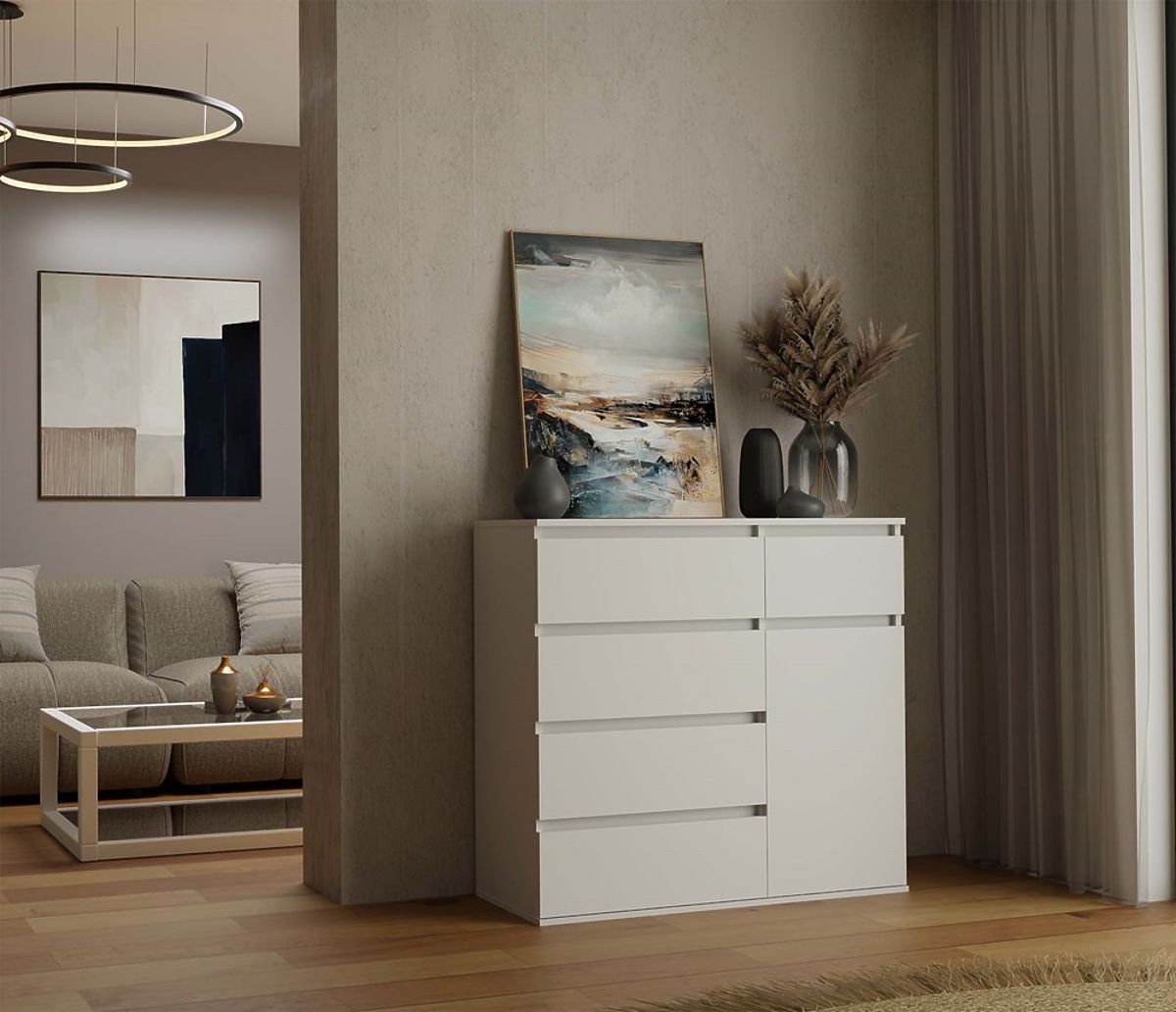 Komoda 1D5S u bijeloj boji savršena je kombinacija estetike i praktičnosti, idealna za moderne i klasične interijere.