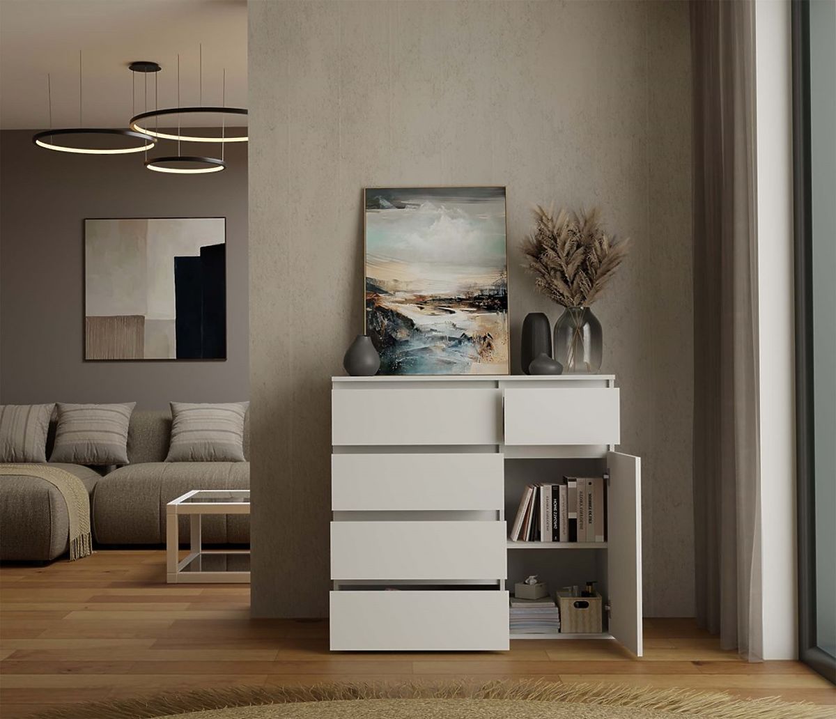 Komoda 1D5S u bijeloj boji je elegantan i funkcionalan komad namještaja, idealan za spavaću sobu, dnevni boravak, hodnik ili dječju sobu.