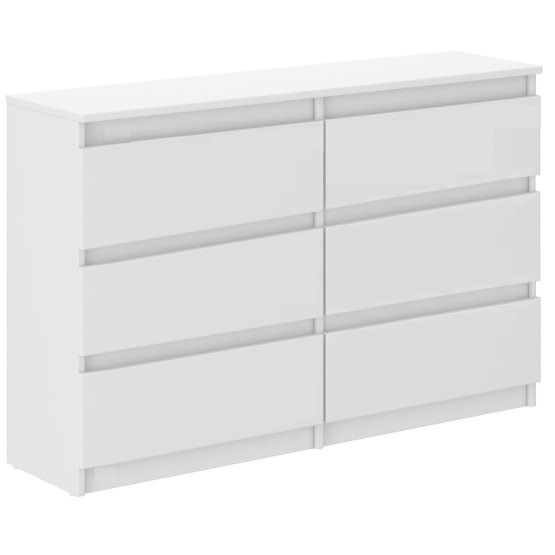 Prostrana snježno bijela komoda s šest ladica i jednostavnim dizajnom. .. više