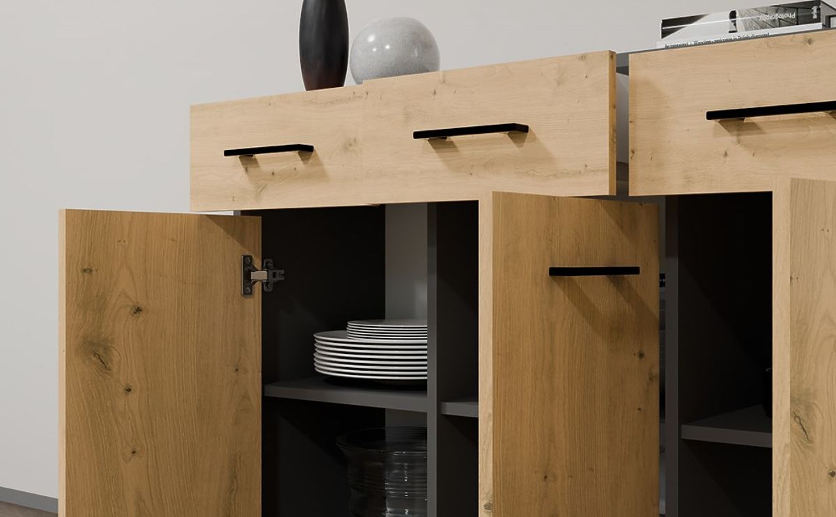 Komoda Simplo 3D3S kombinacija je stila i funkcionalnosti, savršena za dnevni boravak, spavaću sobu, predsoblje ili dječju sobu. Moderna kombinacija tamnog korpusa u antracit boji s prirodnim dekorom fronti hrasta artisan unosi toplinu i eleganciju u interijer.