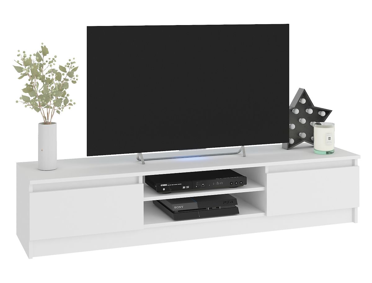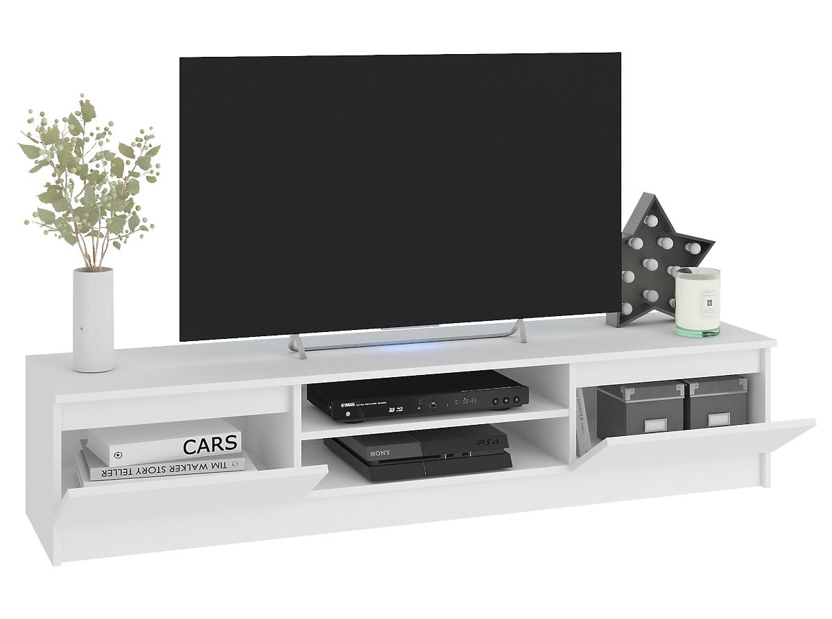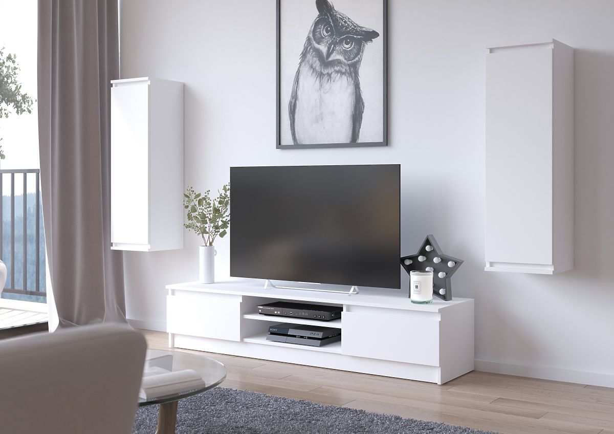 TV ormarić i viseći ormarići u bijeloj boji savršeno se uklapaju u moderan interijer. Nijansa klasične bijele je toliko univerzalna da će set namještaja izgledati efektno kako u sobi s pastelnim bojama, tako i u dnevnom boravku sa zidovima ili tepihom u tamnijim tonovima. Namještaj je izrađen od laminirane ploče s ABS rubom, koja je otporna na habanje, ogrebotine i dugotrajnu upotrebu.