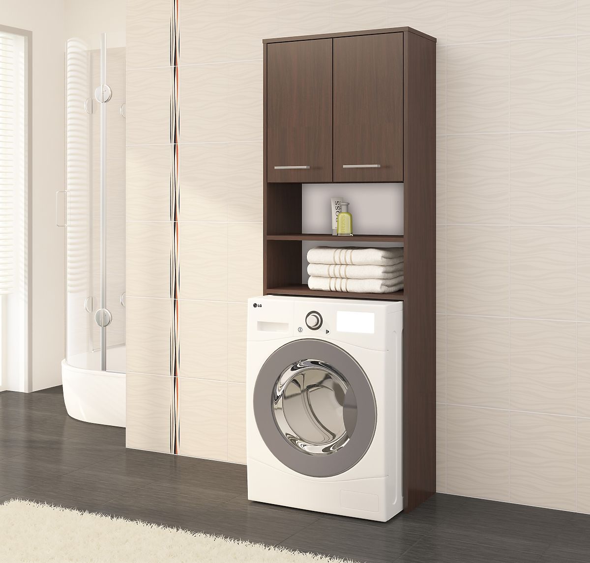 Kupaonski ormarić iznad perilice s policama i ormarićem. .. više