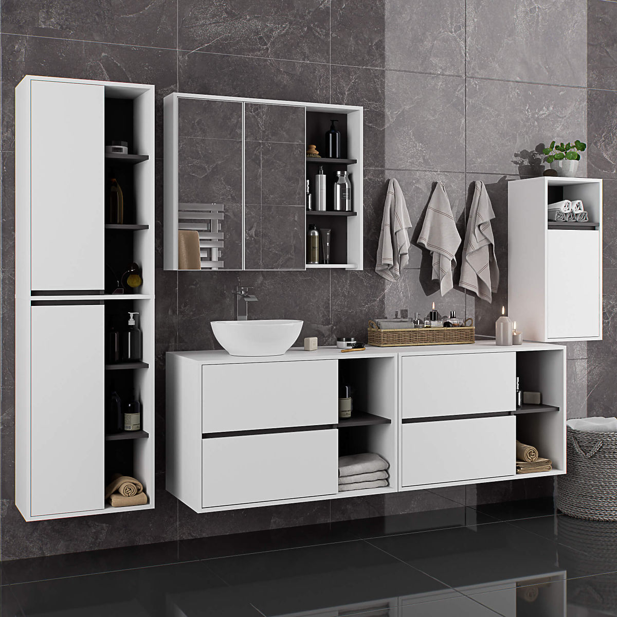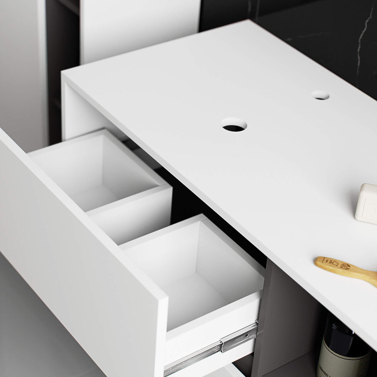 Viseći kupaonski ormarić ispod umivaonika 90 cm VAMI W90 savršeno se uklapa u moderan interijer. Konfiguracija s 2 ladice i 2 otvorene police nudi veliku udobnost pri korištenju. U prostrane ladice mogu se pohraniti higijenski i kozmetički proizvodi, a na otvorene police postaviti dekoracije koje će interijeru dati osobni karakter. Opisani model visećeg ormarića ispod umivaonika ima 2 otvora u ploči namijenjena za montažu umivaonika i sifona. Ormarić također ima posebno oblikovane ladice koje omogućuju instalaciju sifona i hidrauličkih elemenata. PAŽNJA! Namještaj se isporučuje bez umivaonika i armature.