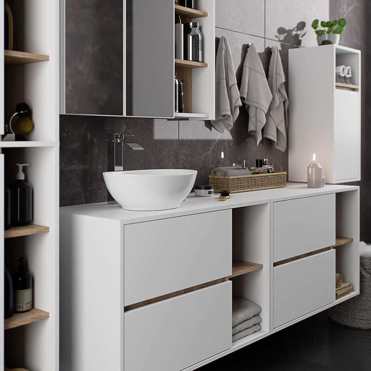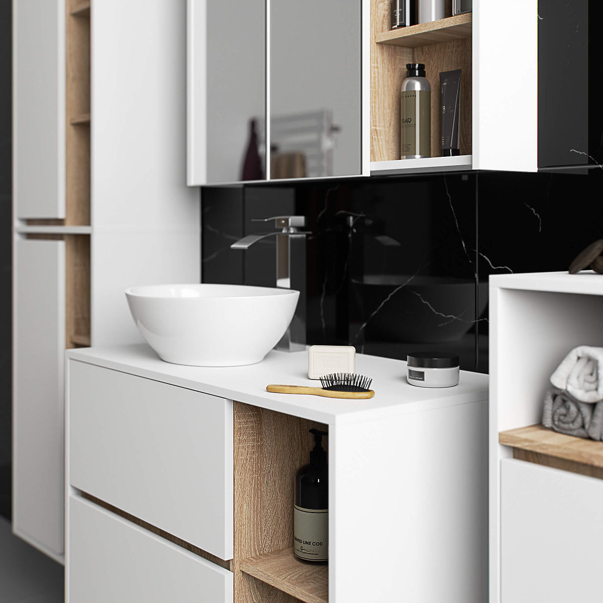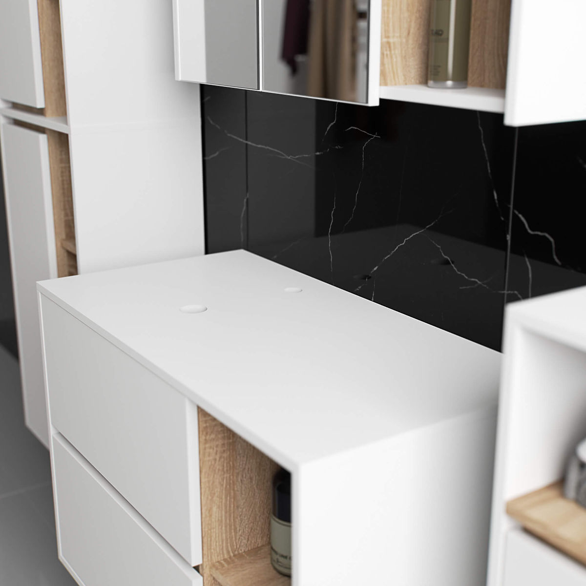 Viseći ormarić za kupaonicu ispod umivaonika 90 cm VAMI W90 savršeno se uklapa u moderan interijer. Konfiguracija s 2 ladice i 2 otvorene police nudi veliku udobnost pri korištenju. U prostrane ladice možete pohraniti higijenske i kozmetičke proizvode, dok na otvorenim policama možete postaviti npr. dekoracije koje će interijeru dati osobniji karakter. Ovaj model visećeg ormarića ispod umivaonika ima 2 otvora u ploči namijenjena za montažu umivaonika i sifona. Ormarić također ima posebno oblikovane ladice koje omogućuju instalaciju sifona i hidrauličkih elemenata. PAŽNJA! Namještaj se isporučuje bez umivaonika i armature.