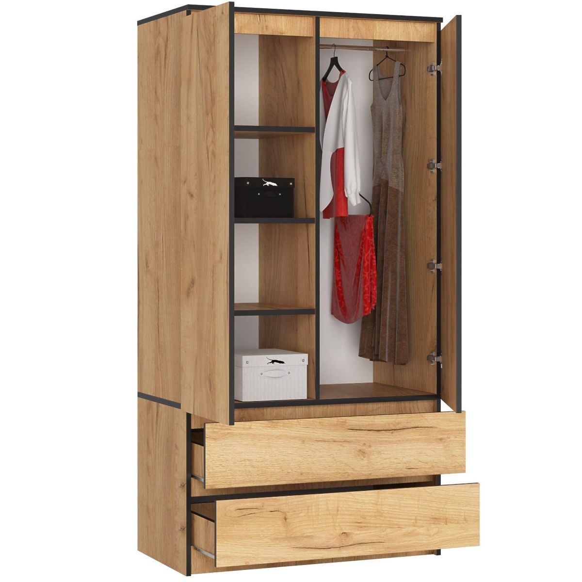 Dvokrilni ormar izrađen je od izdržljive laminirane ploče. Korpus namještaja je u boji hrast craft. Donji dio ormara čine dvije ladice postavljene paralelno jedna iznad druge, dok je gornji, viši segment podijeljen na dva dijela. Lijevi dio sadrži niz od 4 police, dok je desni, opremljen šipkom, namijenjen za vješanje odjeće.