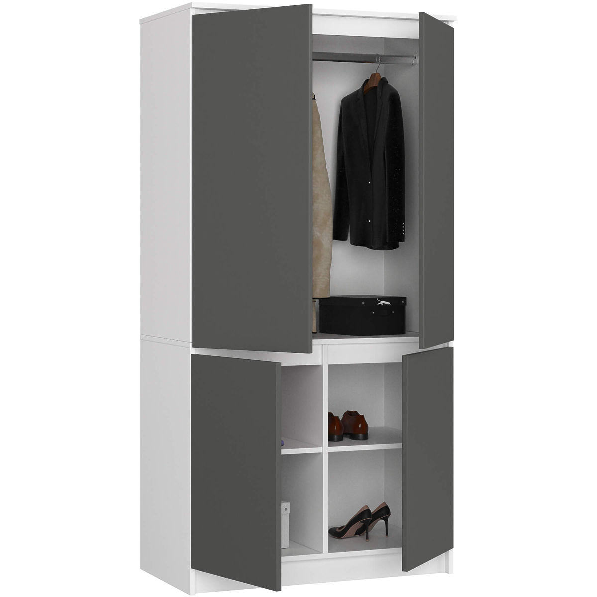 Četverovratni ormar je univerzalan i praktičan komad namještaja koji će savršeno nadopuniti opremu spavaće sobe, hodnika ili dnevnog boravka u studijskim interijerima. Elegantna izvedba i boje bijela grafitno siva čine da ormar savršeno odgovara klasičnim i modernim aranžmanima. Ormar je opremljen prostranim policama koje su idealne za pohranu odjevnih predmeta ili zamjenskih navlaka za pokrivače i jastuke, plahti, stolnjaka ili deka. U dijelu namještaja smještenom iza preklopnih vrata nalazi se šipka za vješalice. Police se mogu koristiti za džempere, bluze, torbice, ali i na primjer za ručnike. S druge strane, šipka će poslužiti kao mjesto za vješanje odijela, haljina, suknji i gornje odjeće, poput kaputa ili jakni. Namještaj se odlikuje pažljivom izradom od najkvalitetnije laminirane ploče otporne na habanje. Rubovi ormara završeni su estetskim ABS rubom.