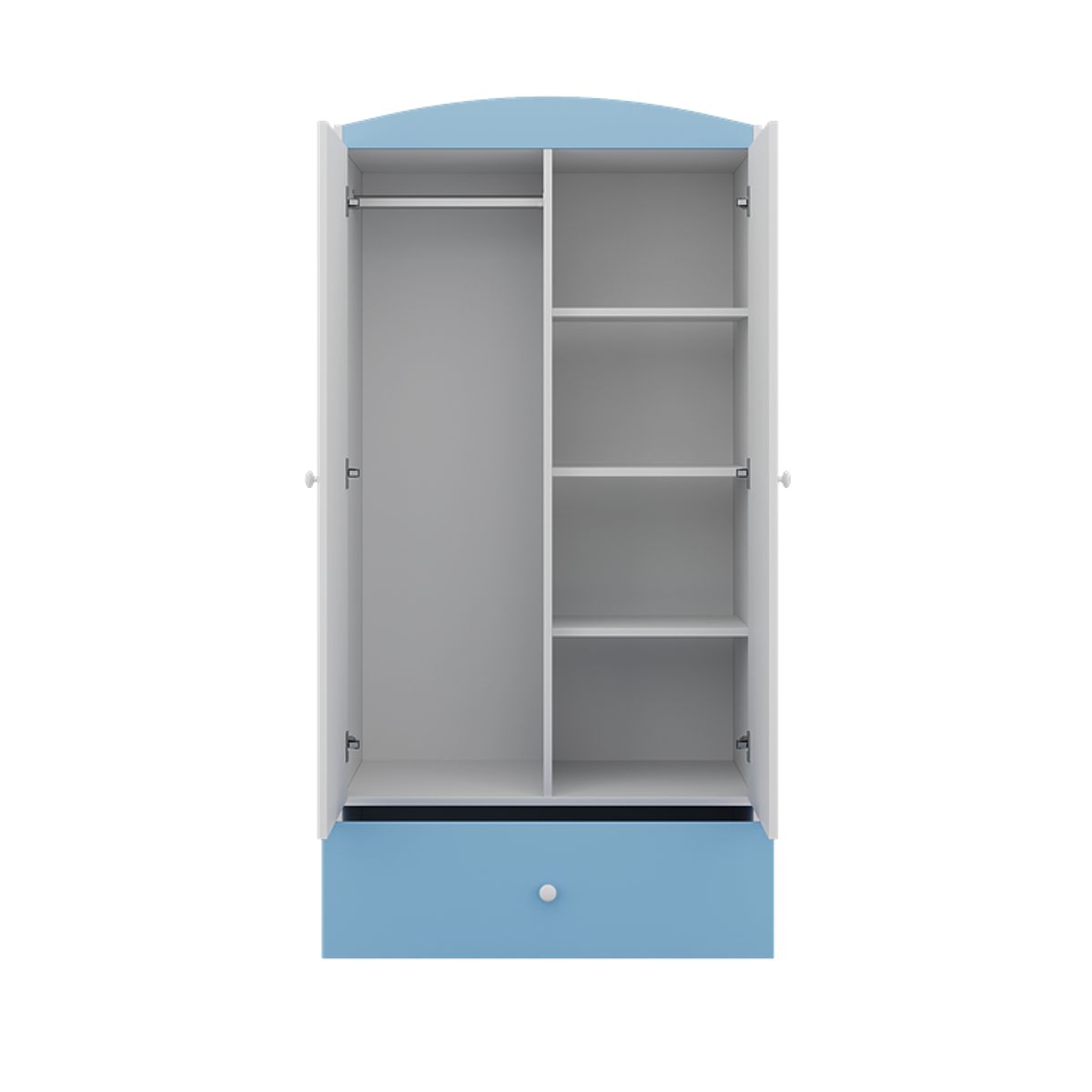 Izrađen je od laminatne ploče koja je u skladu s europskim standardima. Ima jednu veliku ladicu, koja je pomična zahvaljujući šini. Ormar je izrađen u prekrasnoj plavo bijeloj kombinaciji, uklapa se u sve dječje sobe i ne samo u njih!