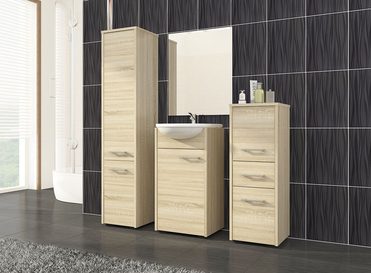 Visoki kupaonski ormarić Fin 2 vrata je univerzalni namještaj koji se može koristiti u svakoj kupaonici, bez obzira na njezinu veličinu. Elegantni dizajn i boja hrast sonoma osiguravaju da ormarić savršeno pristaje u kupaonicu bilo kojeg stila, s klasičnom ili modernom opremom, te uz pločice i keramiku u raznim nijansama. Zahvaljujući svojim dimenzijama, visoki kupaonski ormarić može ispuniti često neiskorišten prostor u kutu kupaonice, kao i biti smješten pored umivaonika, automatske perilice rublja ili tuš kabine. Stojeći kupaonski ormarić Fin odlikuje se vrlo pažljivom izradom. Ima dvoja udobna i široka vrata s ergonomskim ručkama koje osiguravaju udoban pristup unutrašnjosti namještaja. Duboke i prostrane police izvrsne su za pohranu ručnika, toaletnih potrepština, kozmetike ili sredstava za čišćenje u ormariću. Visoki kupaonski ormarić izrađen je od laminirane ploče otporne na habanje i vodu. ABS rubovi, kojima je ormarić završen, su izdržljivi, ne blijede i dodatno štite ormarić od oštećenja.