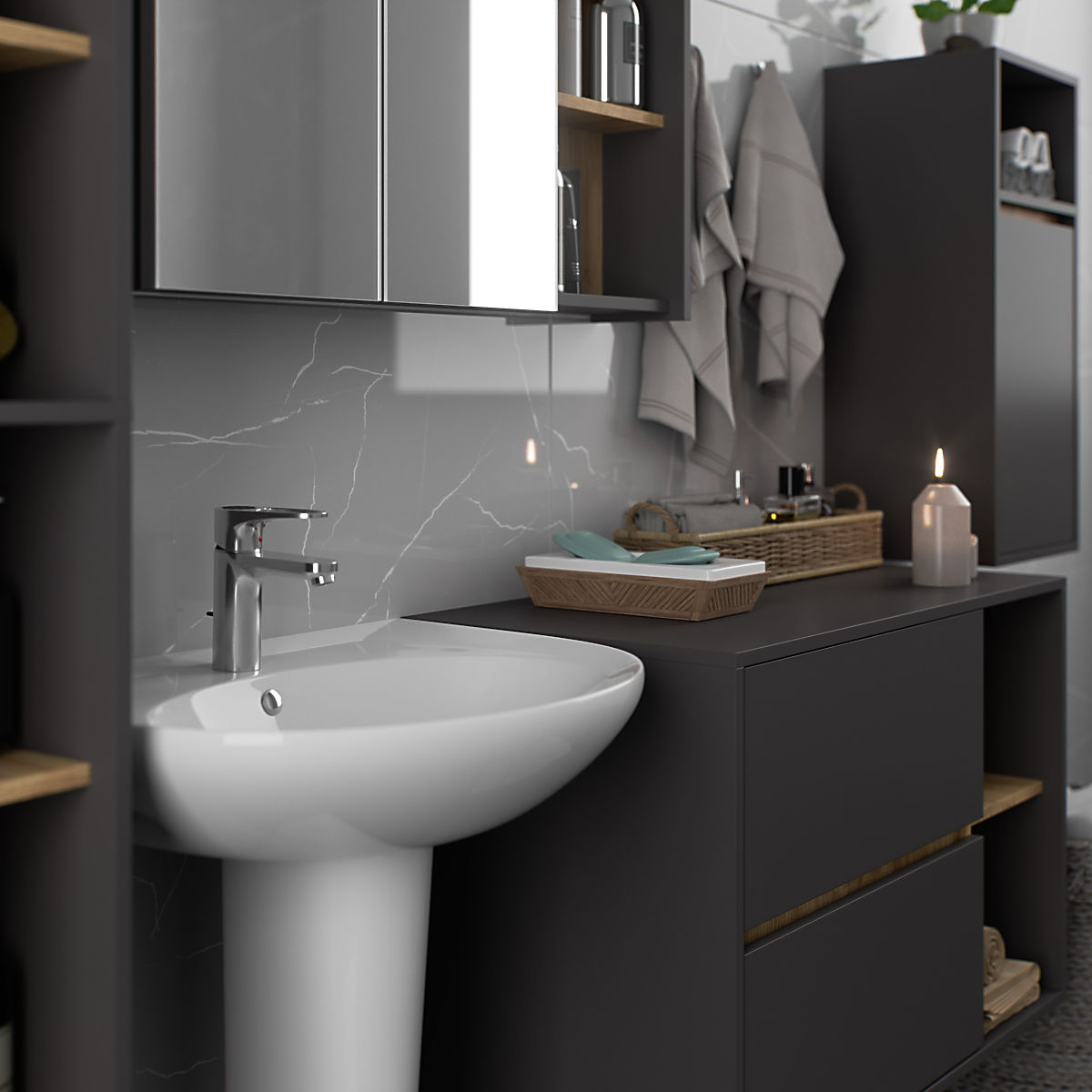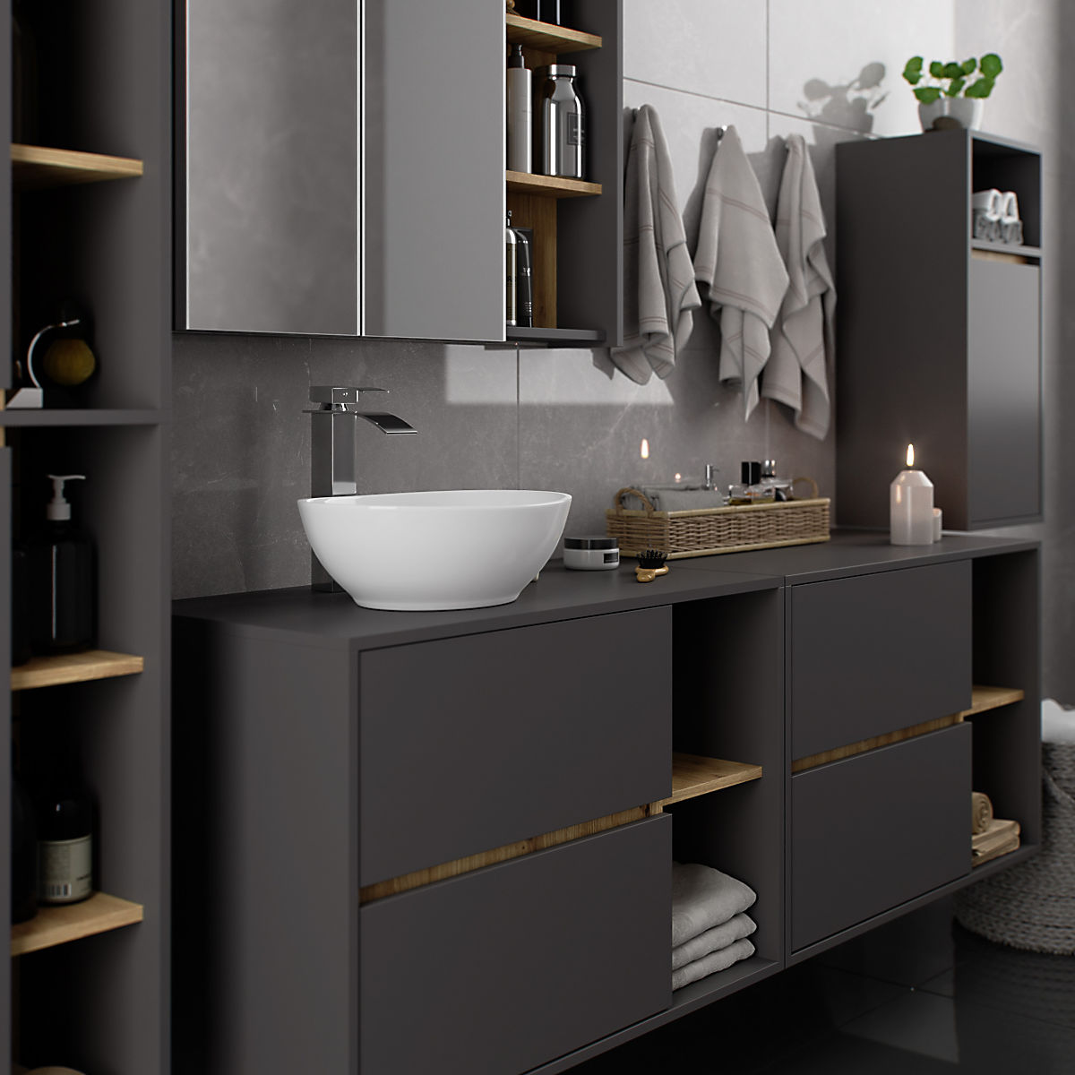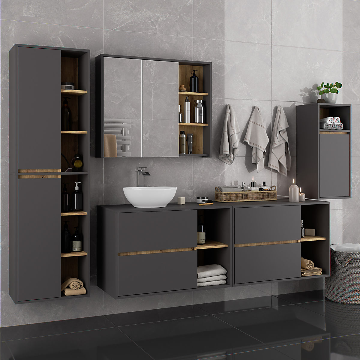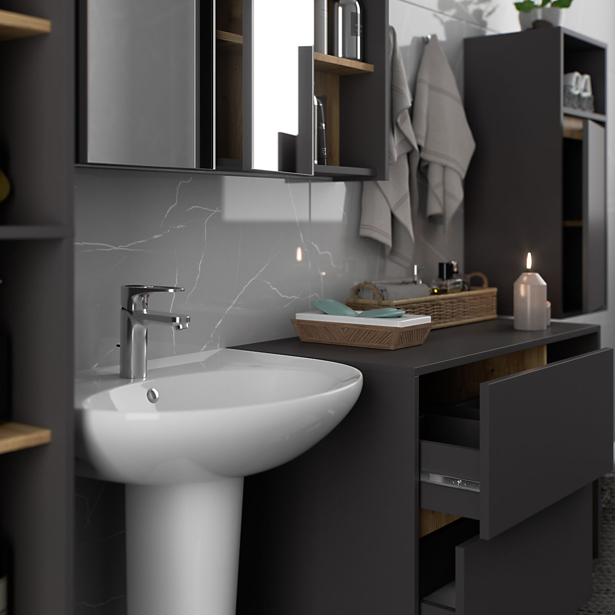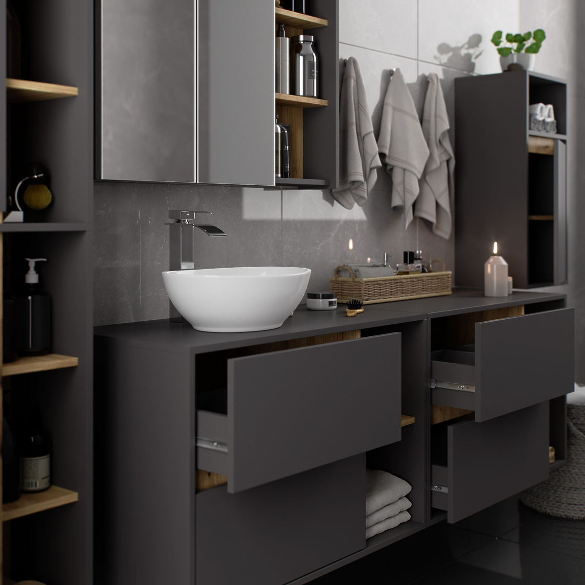 Kupaonski ormarići savršeno nadopunjuju opremu kupaonice, pružaju potrebno mjesto za svu kozmetiku i deterdžente te dodaju određeni stil kupaonici. Prostrani ormarići olakšavaju održavanje reda u prostoriji, što pozitivno utječe na estetiku interijera. Kolekcija VAMI odlikuje se privlačnom stilskom paletom boja - korpus i fronte imaju istu boju, dok je unutarnja boja različita.