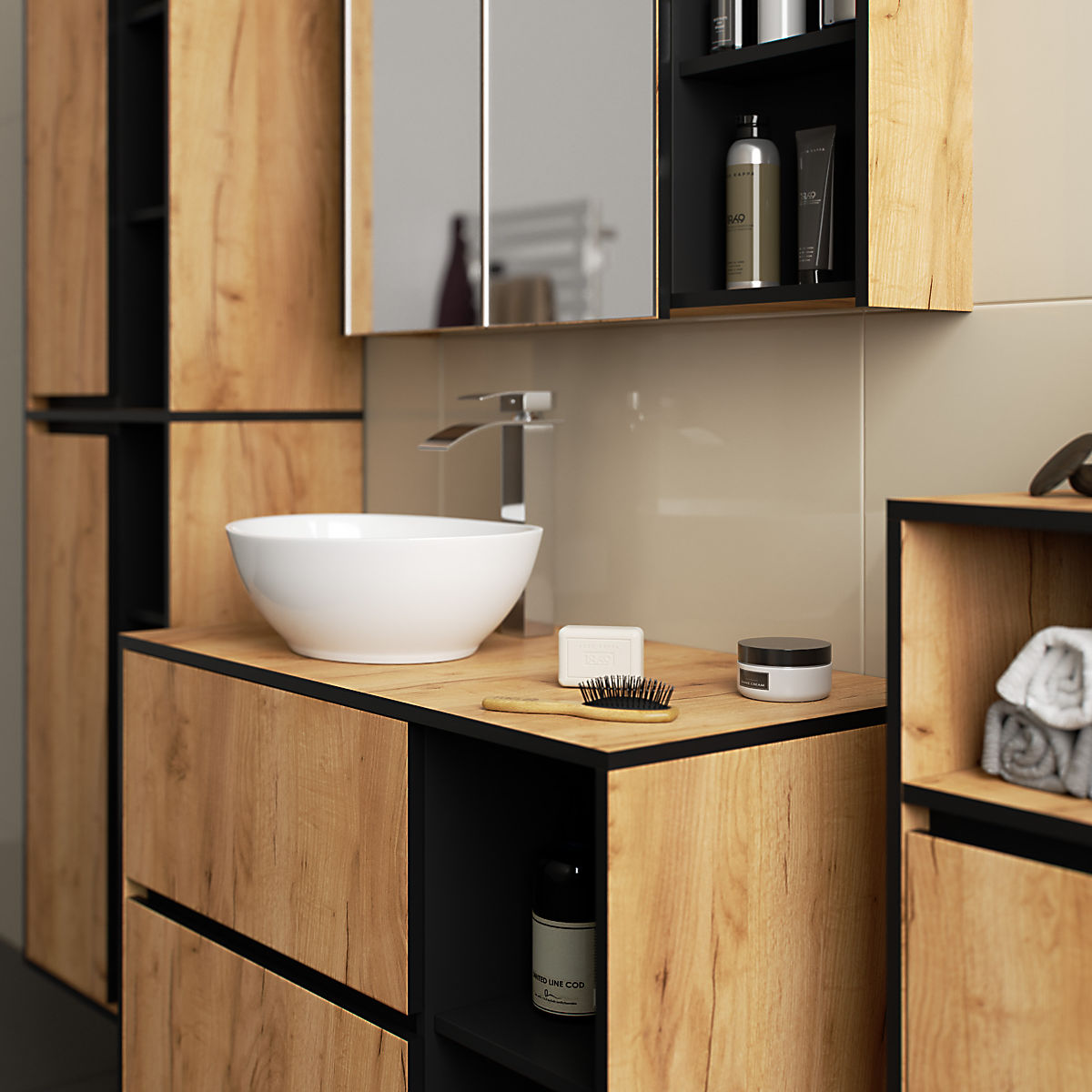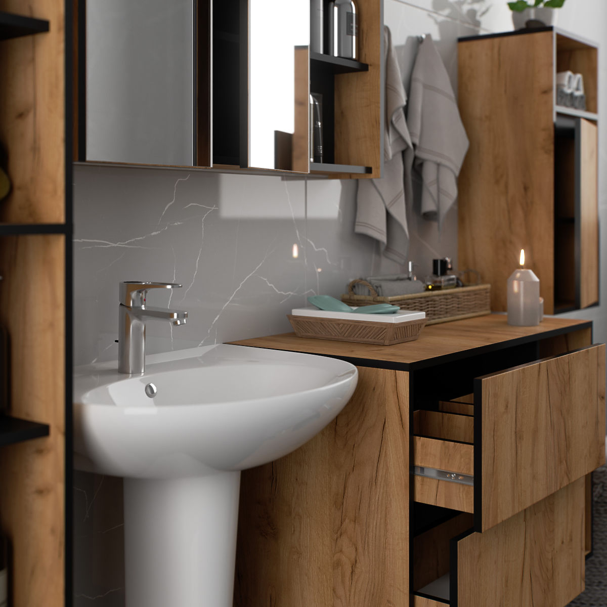Kupaonski ormarići savršeno nadopunjuju opremu kupaonice, pružaju potreban prostor za svu kozmetiku i deterdžente te dodaju kupaonici određeni stil. Prostrani ormarići olakšavaju održavanje reda u prostoriji, što povoljno utječe na estetiku interijera. Kolekcija VAMI ističe se privlačnom stilskom bojom – korpus i fronte su iste boje, dok je unutarnja boja različita.