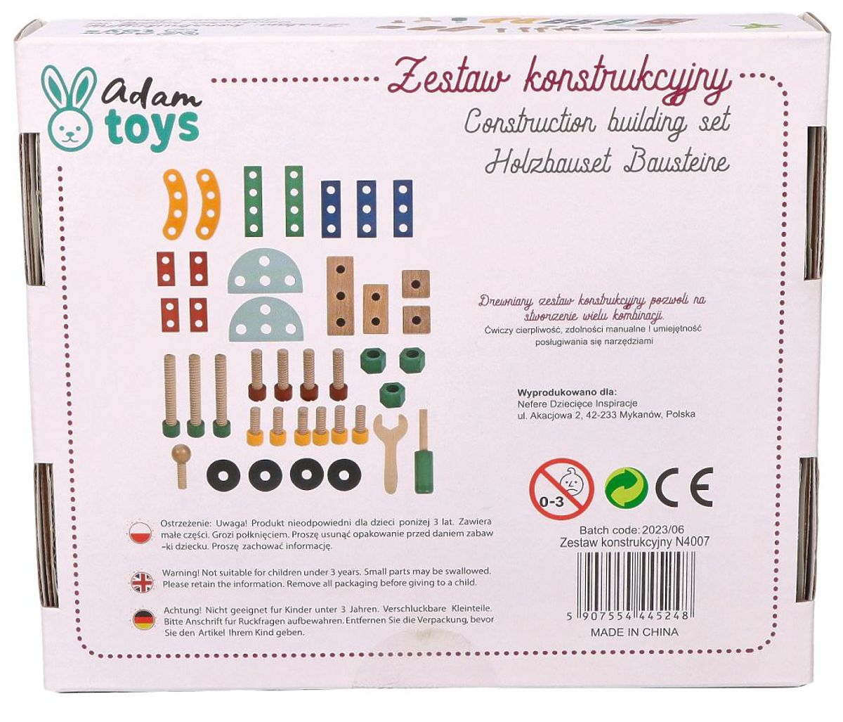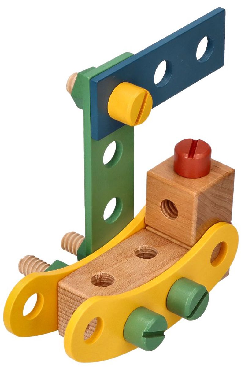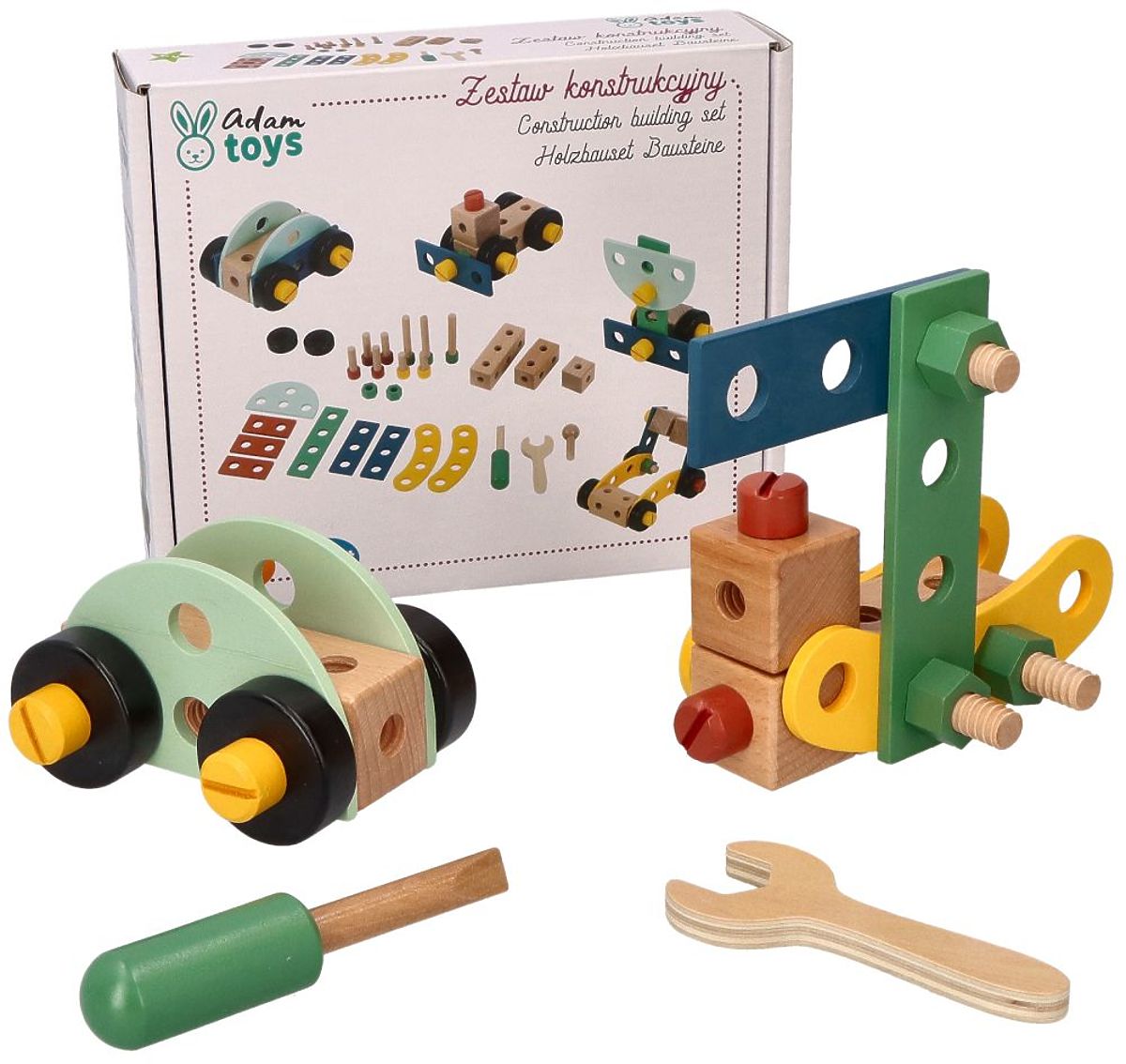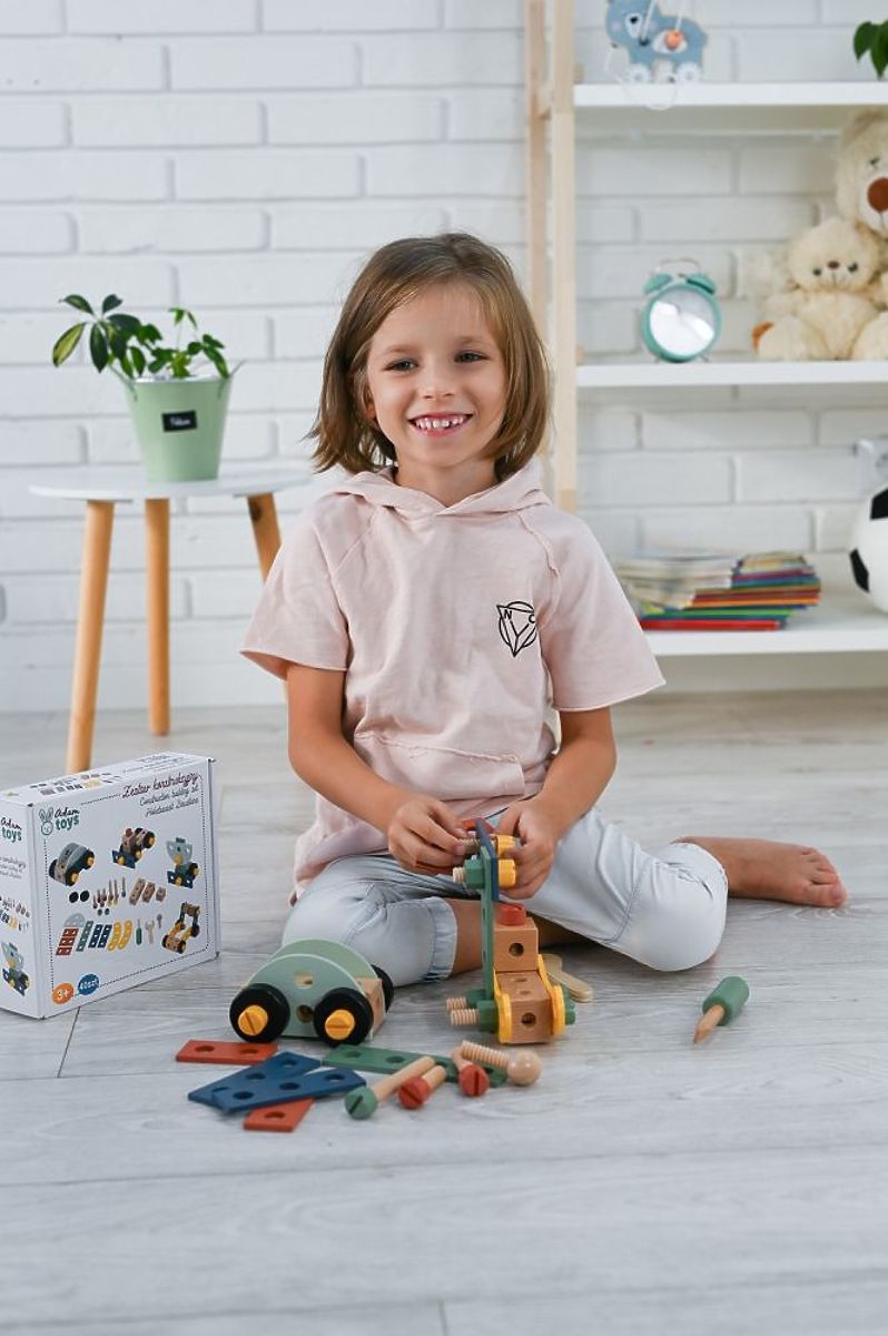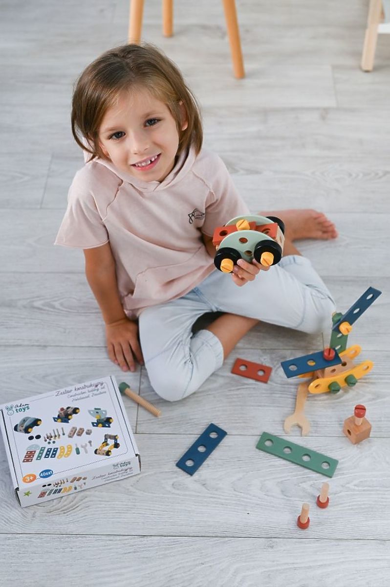Kako odvojiti dijete od sveprisutnih računala, pametnih telefona i tableta? Kako ga potaknuti na igru koja će biti zanimljiva i pružiti zabavu na dulje vrijeme? Drveni konstrukcijski set od 40 dijelova idealan je poklon za malog majstora koji tek započinje svoju avanturu s majstorlukom. Mali konstruktor može koristiti prijedloge projekata ili stvoriti vlastito vozilo ili građevinu. Pomoću priloženih alata: ključa i odvijača, dijete spaja letvice različitih oblika i učvršćuje ih vijcima.