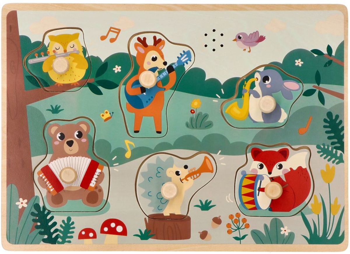 Još jedna zvučna ponuda od Adam Toys uz slagalicu farma i safari. Ovaj put upoznajemo ne samo šumske životinje, već i zvukove raznih instrumenata. Zadatak je, naravno, prilagoditi oblik životinje pravom mjestu na slagalici. Ako to učini ispravno, kao nagradu će čuti zvuk instrumenta na kojem svaka od životinja svira. Ova edukativna igračka izvrsno razvija dječju maštu, uči koncentraciji i sposobnosti opažanja. Dijete također vježba manualne vještine, posebno prstiće, a zvuk ga dodatno potiče na igru.