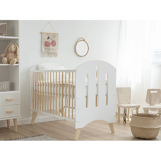 Elegantni bijeli krevetić Baby Dream s prirodnim drvenim nijansama za sigurnost i eleganciju. .. više