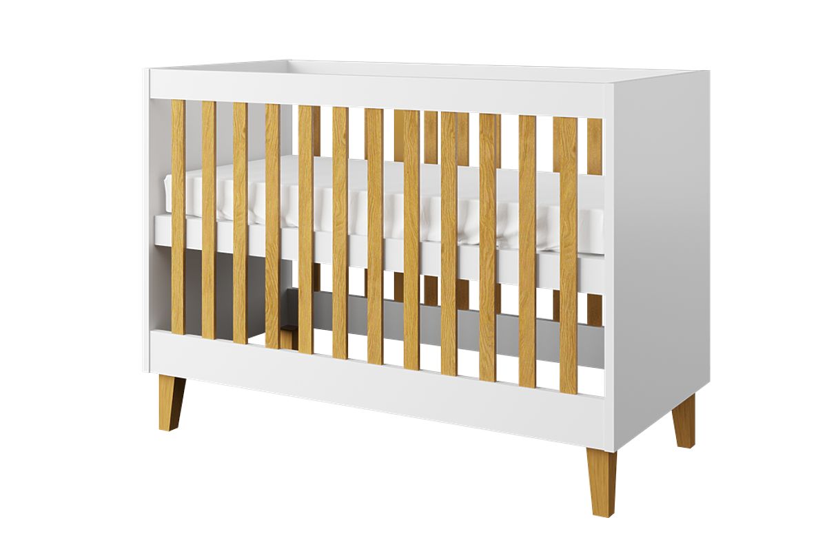 Praktični snježnobijeli KUBI dječji krevetić dimenzija 120 x 60 cm izrađen je od visokokvalitetne laminirane iverice u kombinaciji s masivnom hrastovinom. Zahvaljujući podnici podesivoj po visini, prilagođava se vašem djetetu tijekom njegovog rasta.