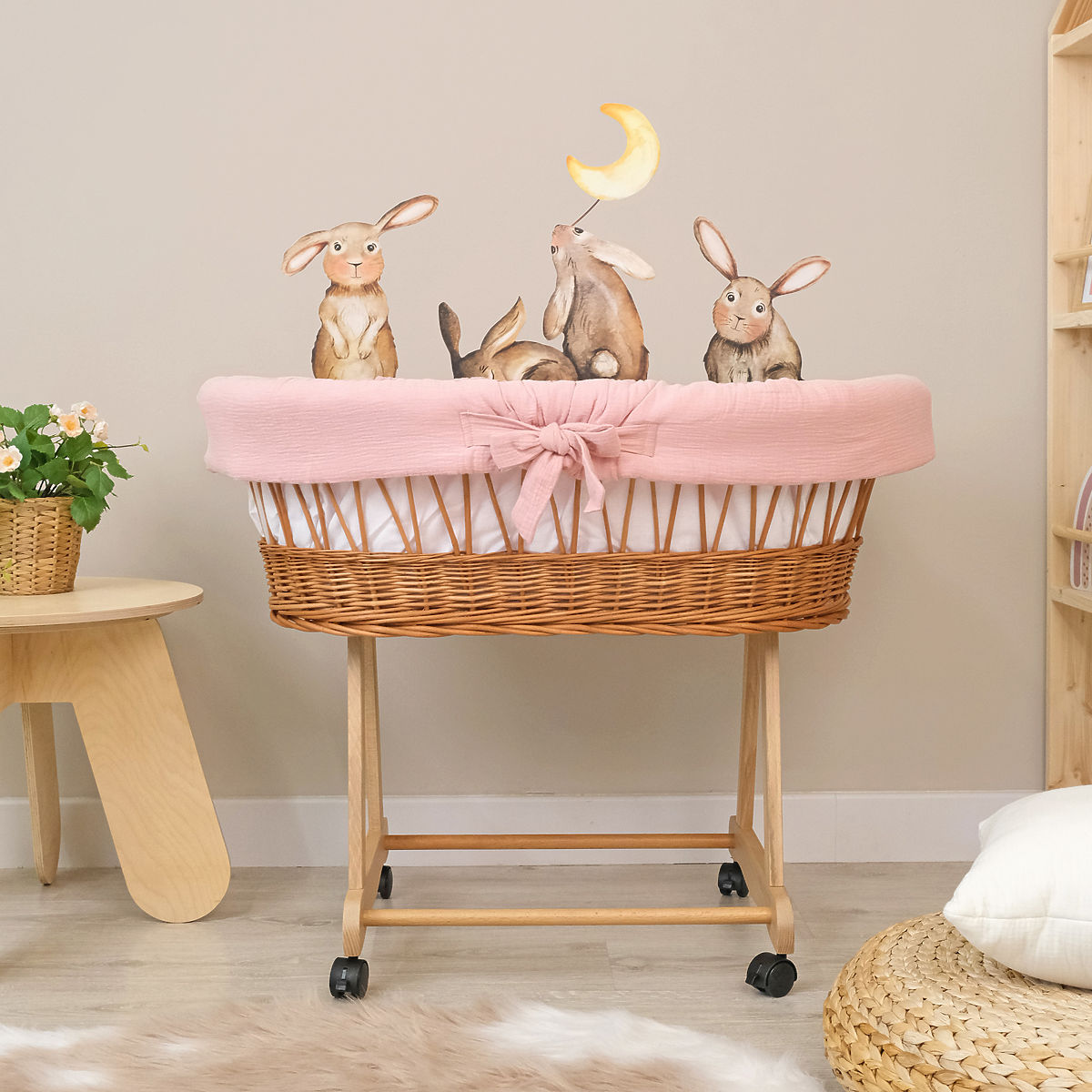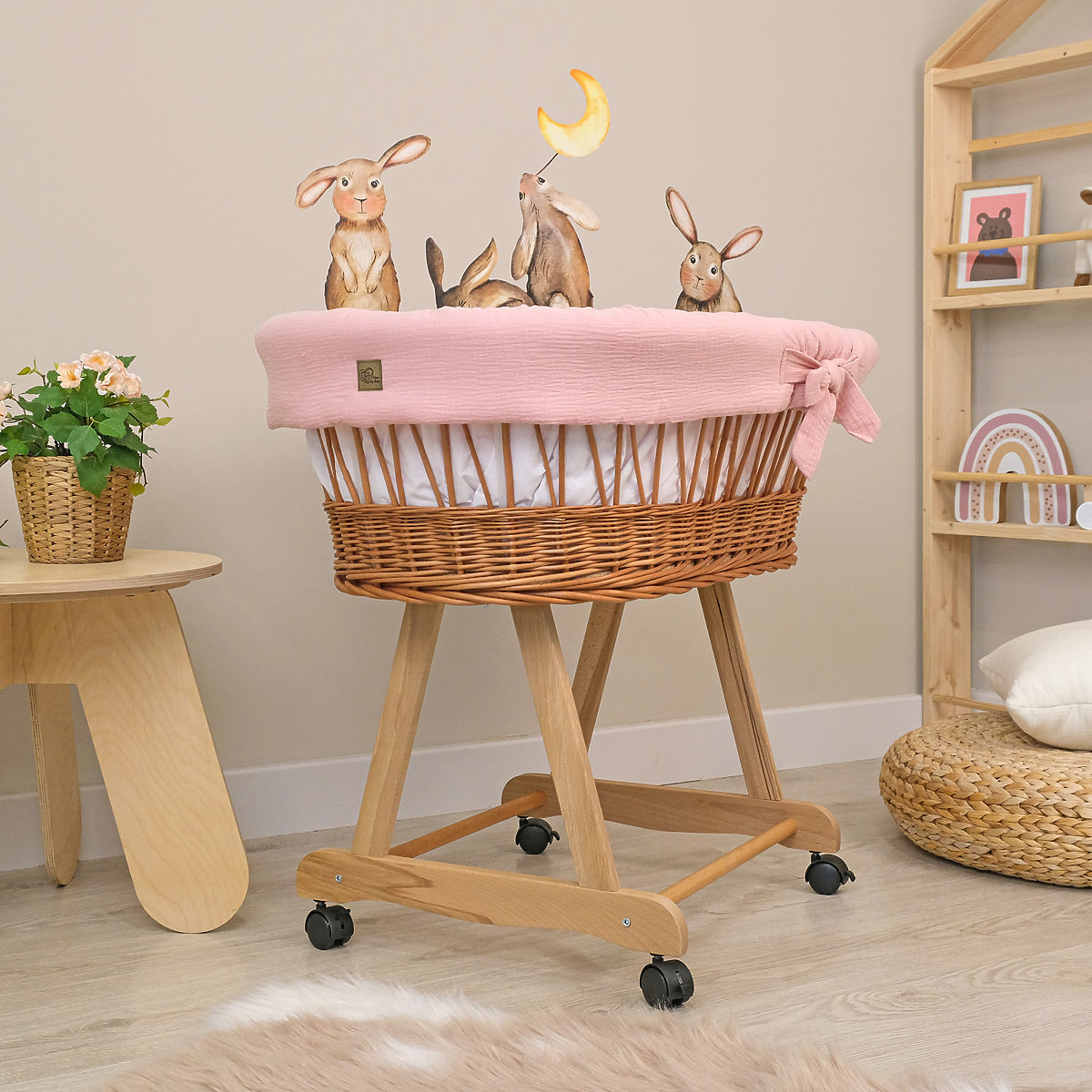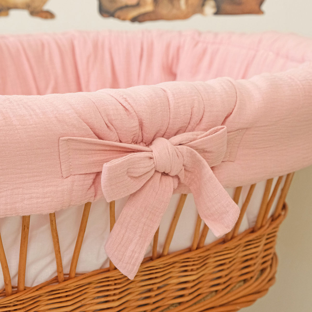 Ova pletena košara stvara savršeno i ugodno mjesto za spavanje vaše bebe bilo gdje u kući. Košara uključuje 4-dijelni set posteljine s punjenjem od muslina, punjenog antialergijskim silikonskim vlaknima. Prozračna i na dodir mekana muslinska posteljina minimizira mogućnost pregrijavanja i osigurava dovoljnu cirkulaciju zraka. Jastuk je ukrašen ušima, ima udubljenje za glavu vaše bebe. Tkanine su nježne na dodir.