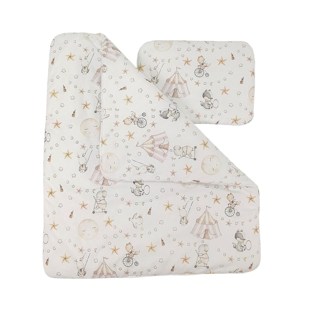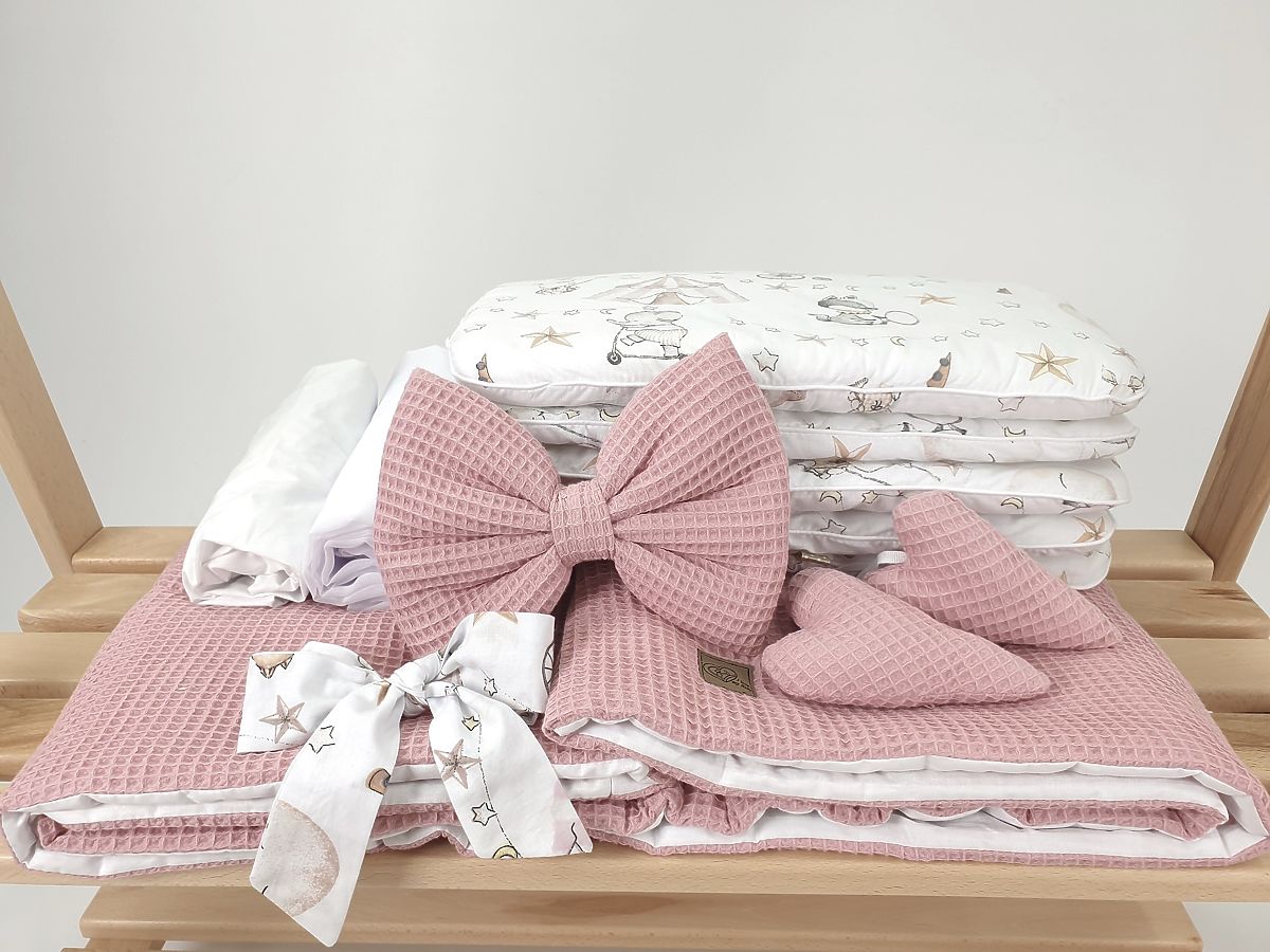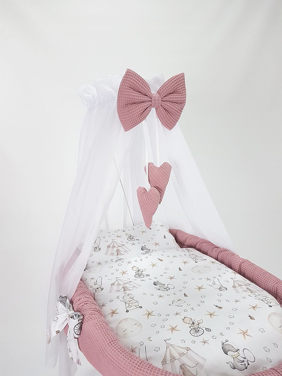 Ova pletena košara stvara savršeno i ugodno mjesto za spavanje za vašu bebu bilo gdje u kući. Bijela košara dolazi s 5-dijelnim setom posteljine s motivom cirkusa od atraktivnog pamučnog vafla.